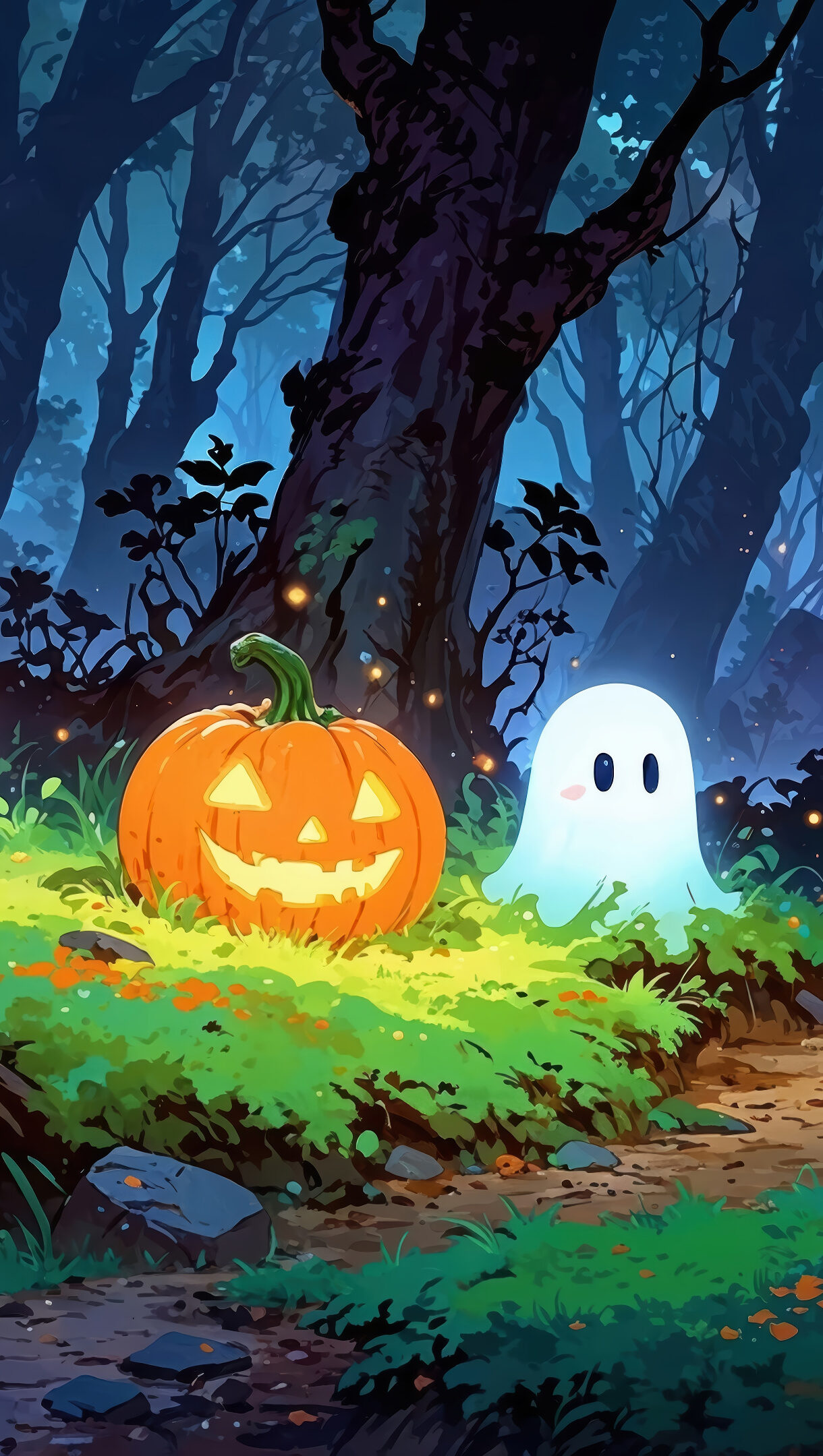 Cute Ghosts And Jack-o’-lantern In Spooky Forest Halloween Digital Art