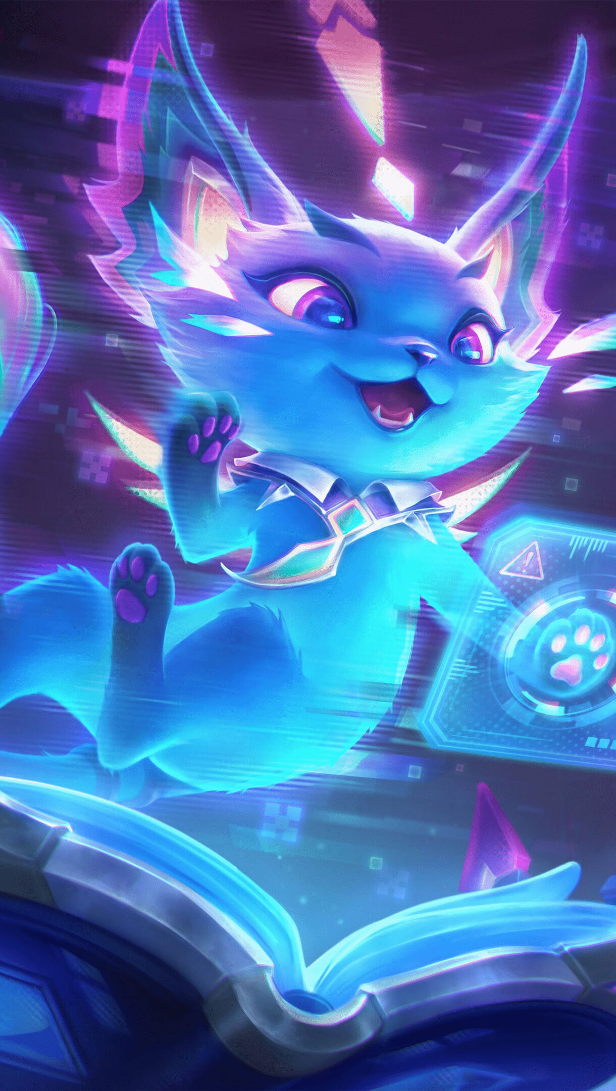 A stunning 4K wallpaper featuring the futuristic Cyber Cat Yuumi skin from League of Legends. Yuumi, the magical cat, is transformed into a cybernetic marvel, adorned with neon accents and digital enhancements, amidst a vibrant cyberpunk cityscape, showcasing her mystical prowess in the digital realm of League of Legends. Simply click the download button to bring this masterpiece to life on your screen as a desktop wallpaper or save it for later in your picture collection.