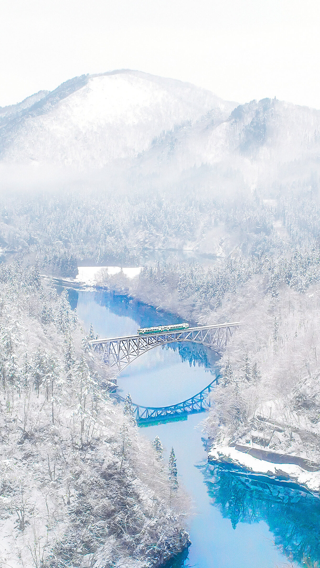 A picturesque 4K wallpaper features the iconic Daiichi Tadami River Bridge in Fukushima, Japan, spanning a bright blue river within a vast, snow-covered winter landscape. A small green and white train is visible crossing the steel bridge, its vibrant colors offering a striking contrast to the surrounding pristine white forests and mountains and the deep turquoise of the river below.