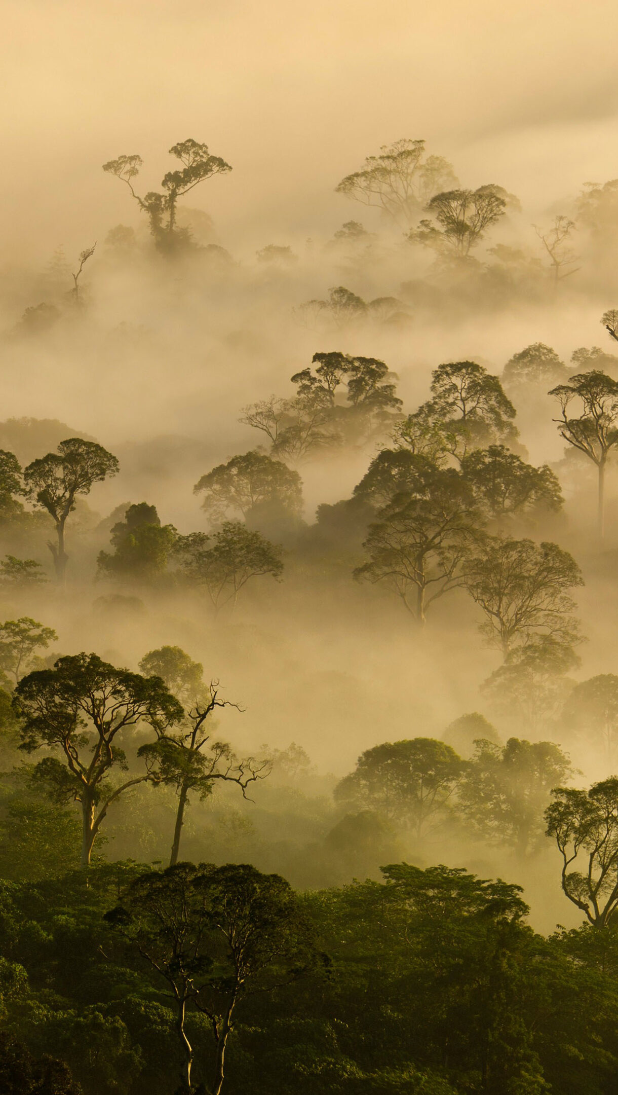 A breathtaking 4K wallpaper revealing the Danum Valley Lowland Rainforest enshrouded in a dense layer of morning mist, with countless tree canopies piercing through the cloudy expanse. Golden light illuminates the upper sections of the trees, creating a serene and ethereal atmosphere.