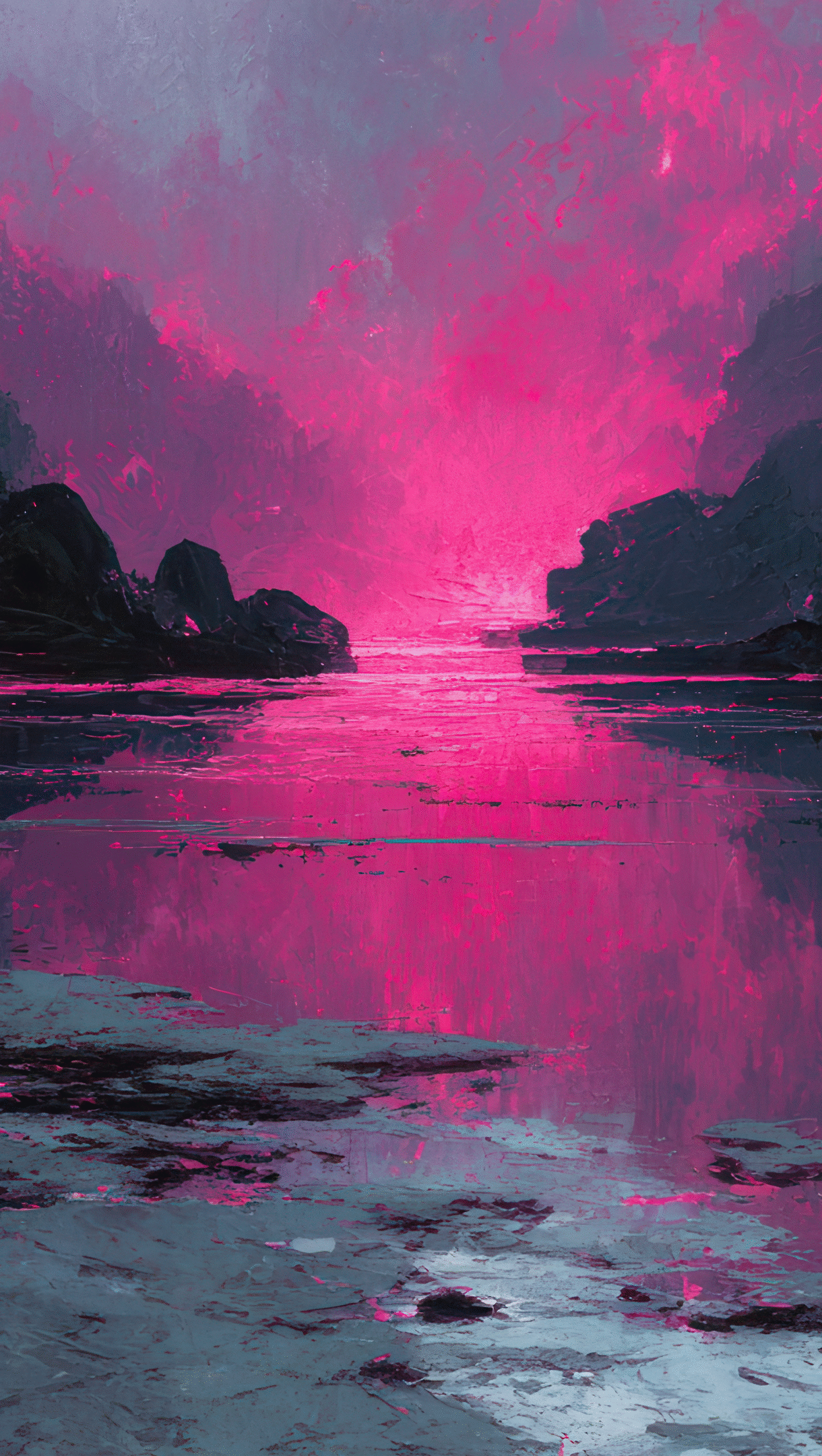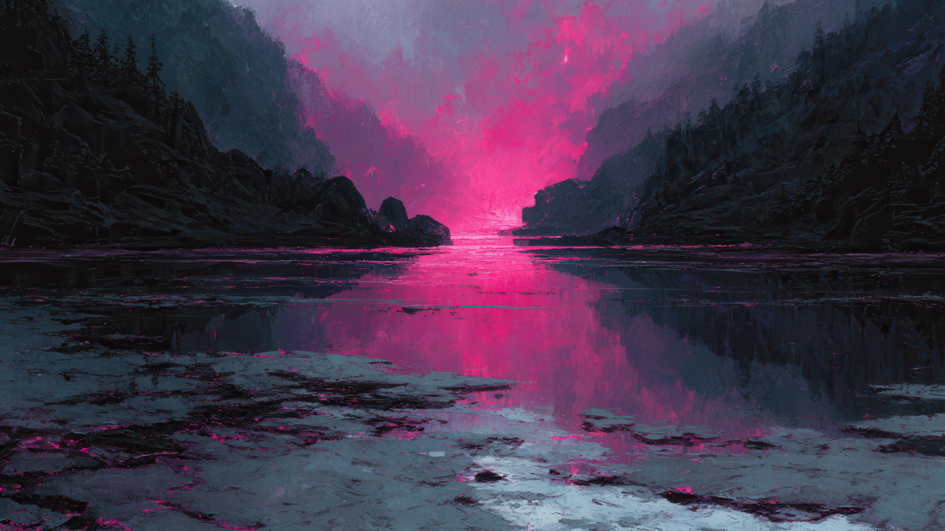 A vibrant 4K wallpaper showcasing a dark mountain lake nestled between looming shadowy cliffs. The lake surface reflects a fiery, intense pink and purple sky, contrasting sharply with the deep blues and blacks of the surrounding landscape and creating a dramatic, textured mood.