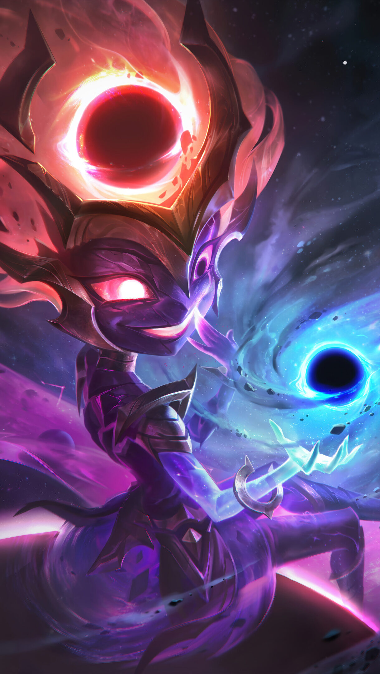 A mesmerizing 4K wallpaper featuring the "Dark Star Zoe" skin from League of Legends, showcasing Zoe with cosmic, star-filled details and a dark, otherworldly aura, perfectly capturing her celestial and playful essence, ideal for fans looking to add a mystical and vibrant touch to their screen. Simply click the download button to bring this masterpiece to life on your screen as a desktop wallpaper or save it for later in your picture collection.