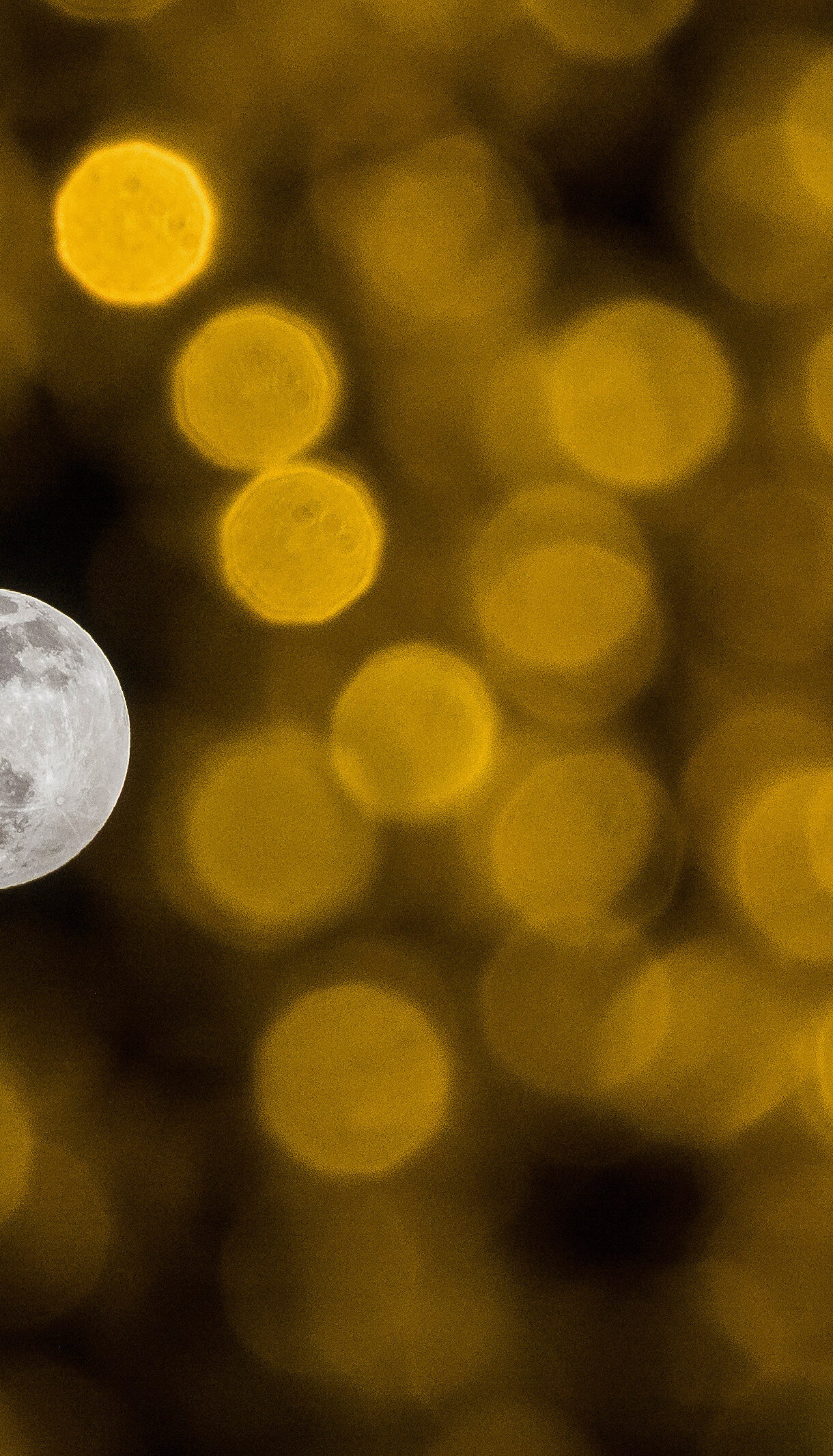 A magical 4K wallpaper of a December full moon set against a festive backdrop of holiday lights. The crisp, detailed full moon gleams amidst a beautiful bokeh of warm golden lights, creating a serene and captivating holiday atmosphere.
