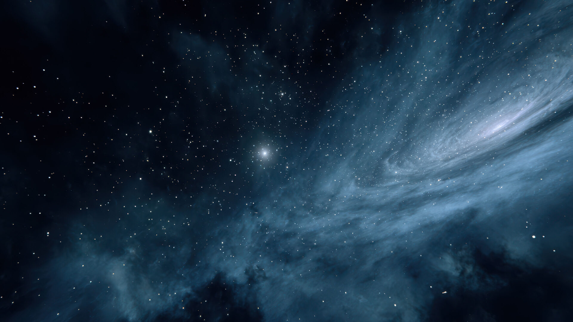 An immersive 4K wallpaper showcases a magnificent blue nebula gently swirling across the vast expanse of deep space. Brilliant distant stars scatter throughout the dark cosmic dust, with a particularly bright star illuminating the ethereal blue gases, evoking a sense of tranquil wonder.