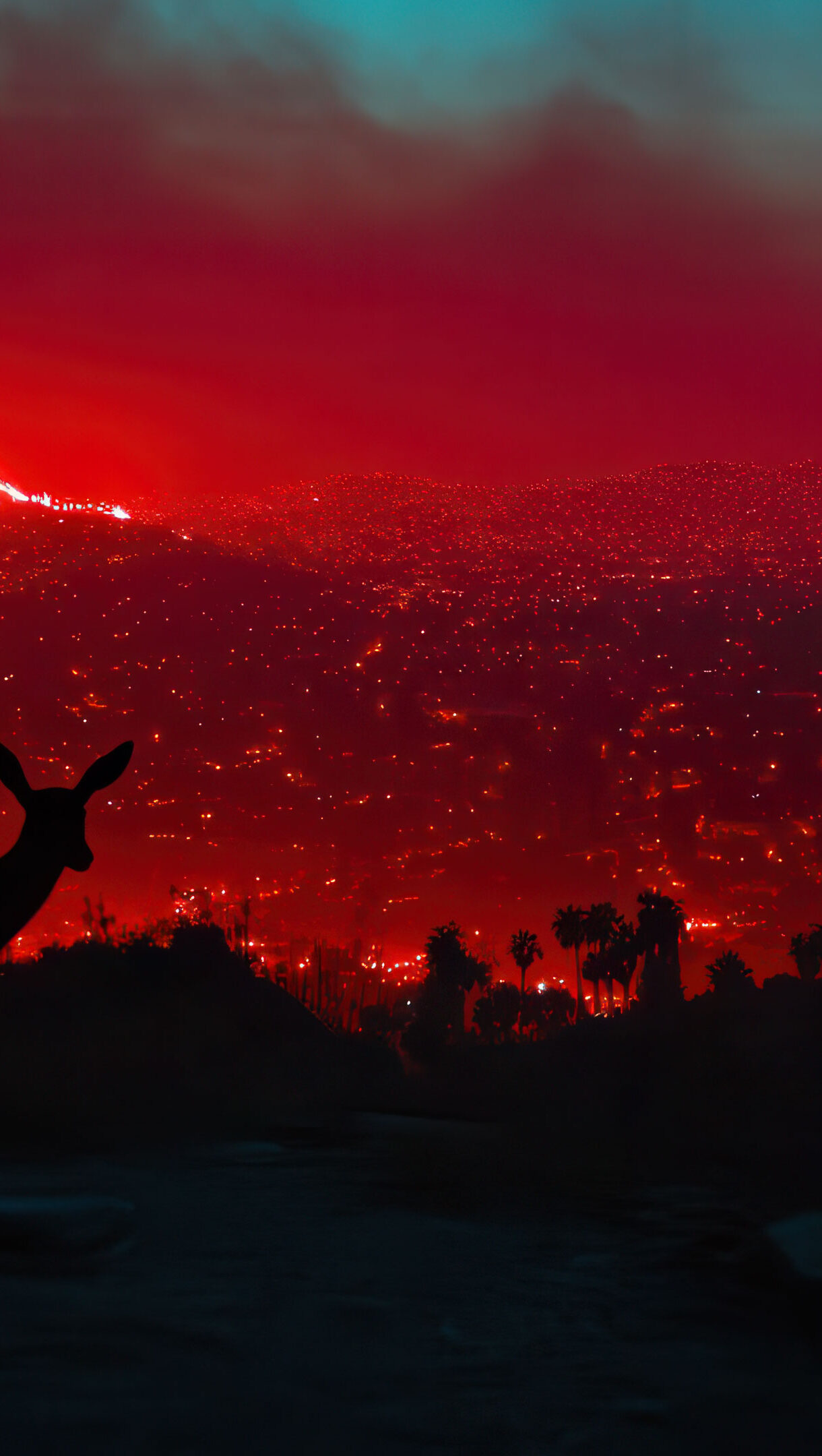 A stunning 4K wallpaper featuring the silhouette of a deer against a fiery landscape at sunset. The warm hues of the sky contrast beautifully with the dark silhouette, creating a dramatic and captivating scene that’s perfect for your desktop or mobile wallpaper.