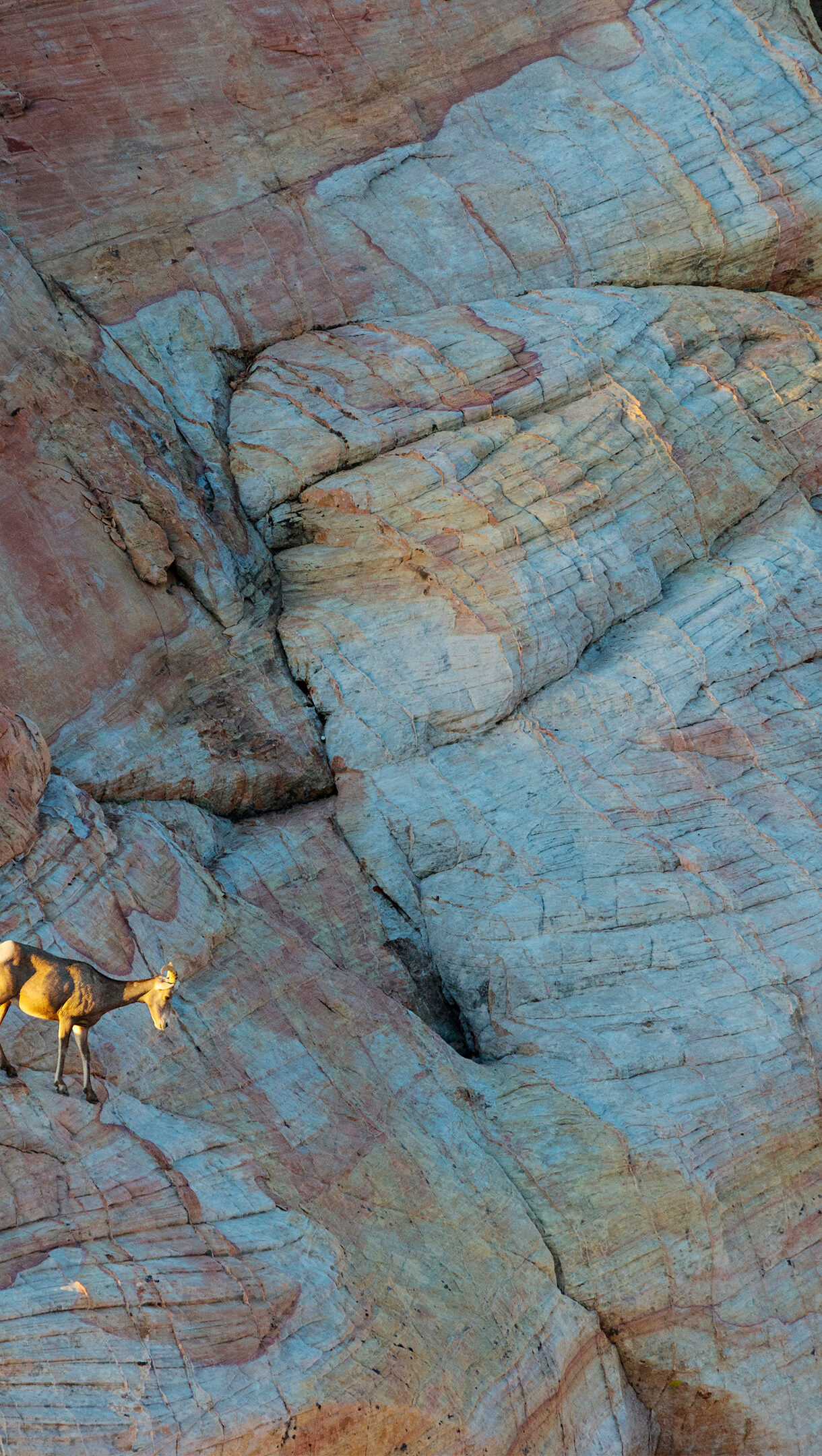 A magnificent 4K wallpaper capturing two Desert Bighorn Sheep navigating the vibrant red rock formations of Valley Of Fire State Park. Golden hour sunlight warmly illuminates their coats and highlights the intricate textures and layered hues of the dramatic rock landscape, creating a sense of rugged beauty.
