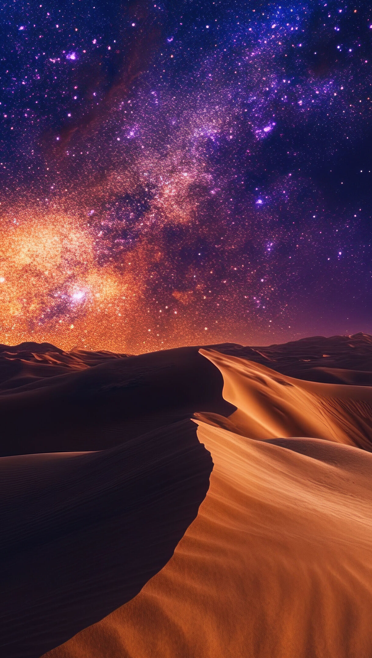 A mesmerizing 4K wallpaper featuring a vast desert horizon under a breathtaking galactic night sky. The AI-generated artwork showcases a cosmic expanse filled with glowing stars and nebulae, casting a celestial glow over the dunes. Perfect for enhancing your desktop or mobile background.