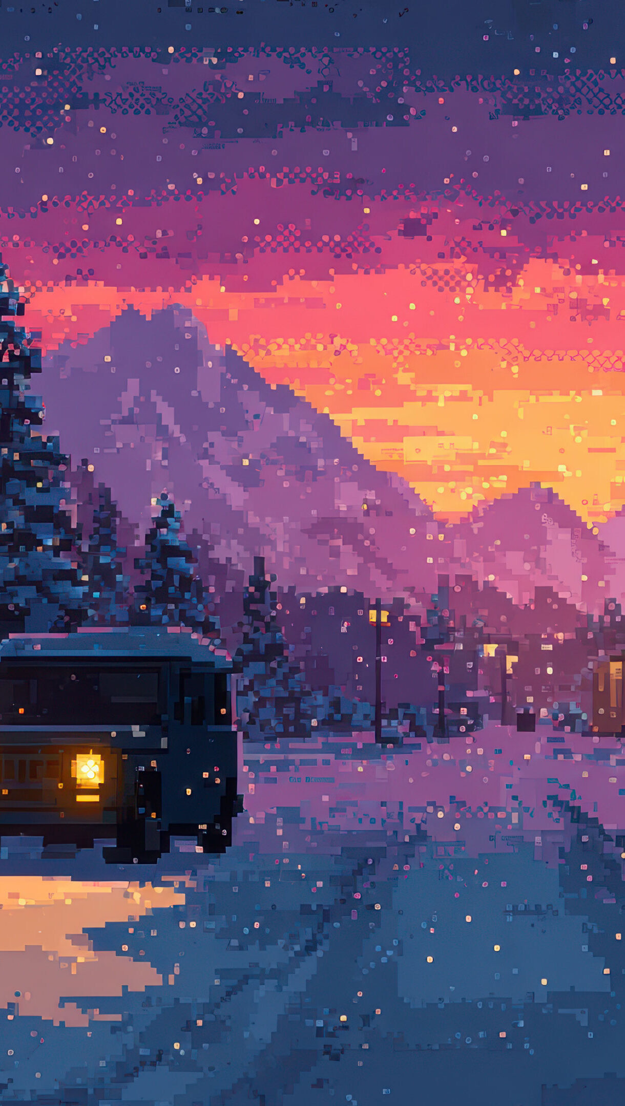 A captivating 4K wallpaper unveils a detailed pixel art serene winter evening landscape, featuring a vintage car parked on a snow-covered road flanked by illuminated pine trees and distant mountains. Gentle snowfall descends as the warm glow of string lights and the car's headlights beautifully contrast with the dramatic pink and orange sunset behind the peaks, enhancing the peaceful mood.