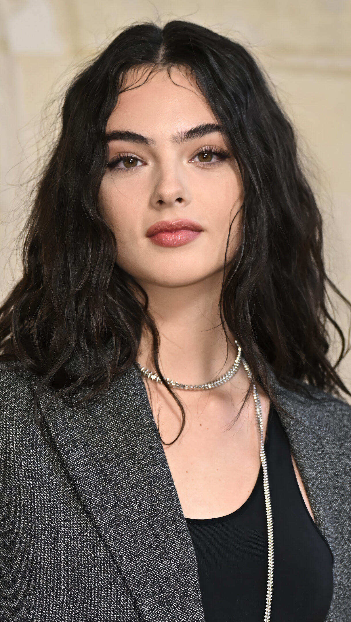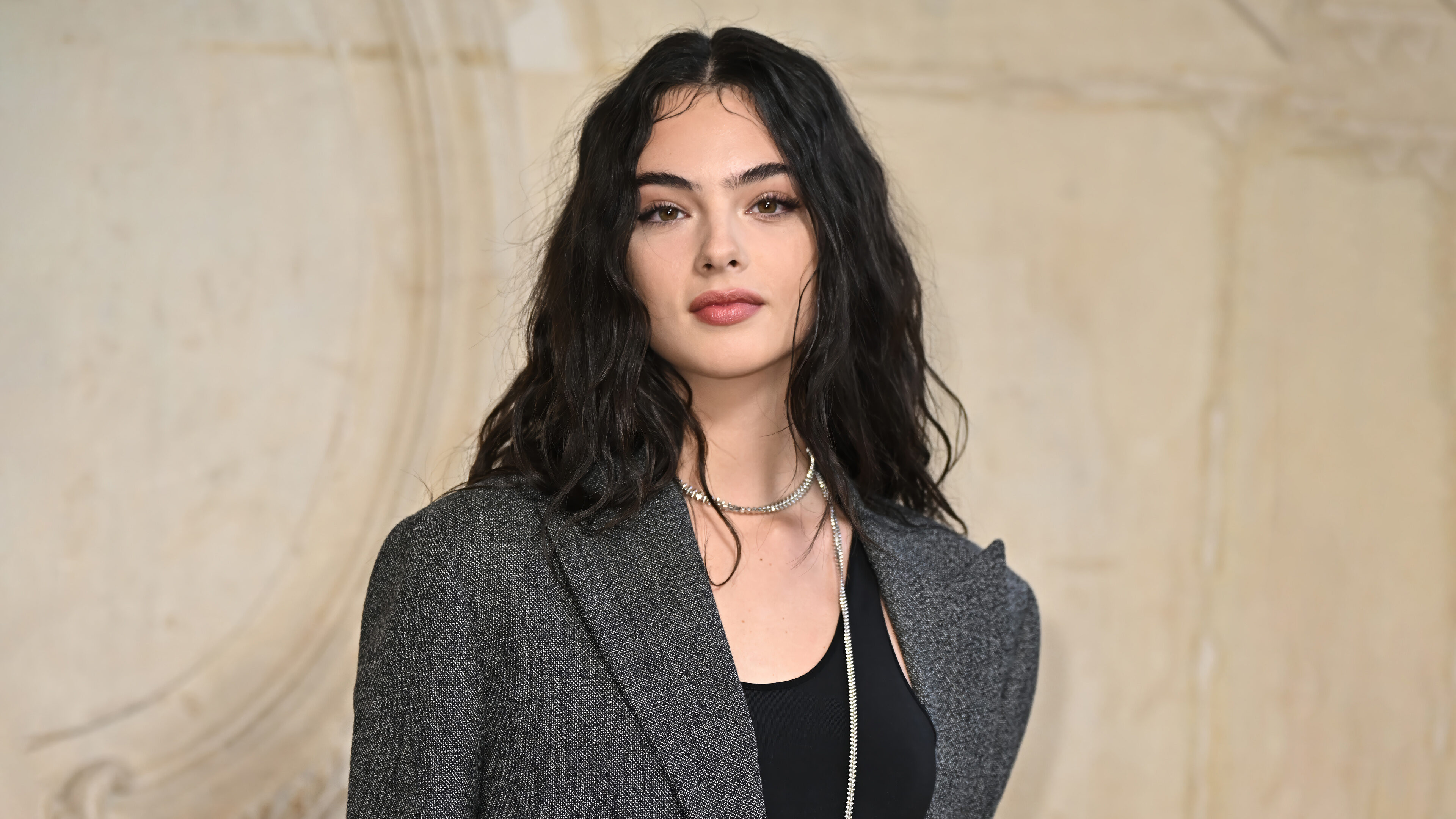 A captivating 4K wallpaper showcases Deva Cassel in a stunning Met Gala portrait, where she stands elegantly composed against a softly blurred, light background. Her direct, calm gaze and flowing dark hair create a sophisticated elegance, highlighted by the subtle texture of her grey blazer and shimmering silver necklace.