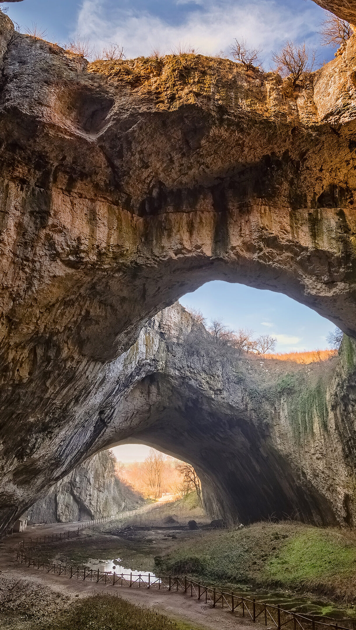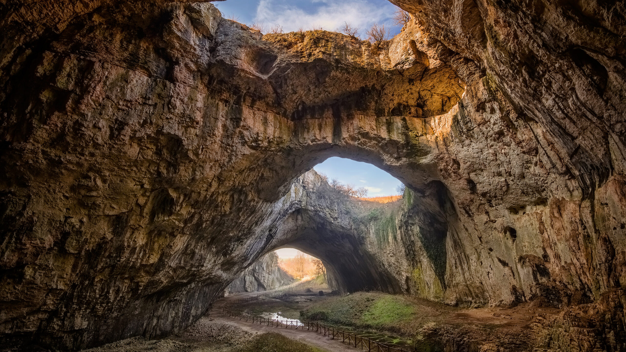 An awe-inspiring 4K wallpaper showcases the grand interior of Devetashka Cave in Devetaki, Bulgaria, defined by its spectacular natural arches and vast skylights. Golden sunlight streams dramatically through the immense ceiling openings, highlighting the textured rock walls and a winding path below.