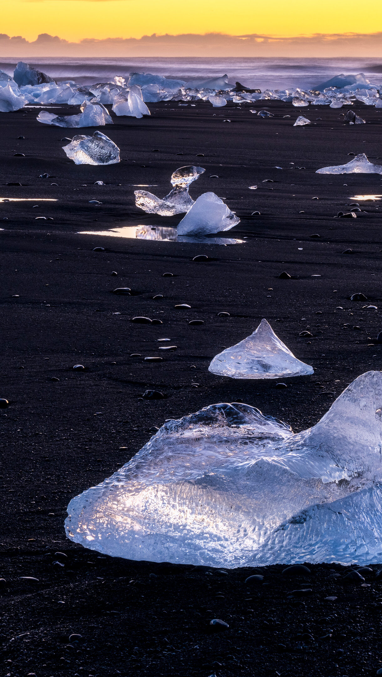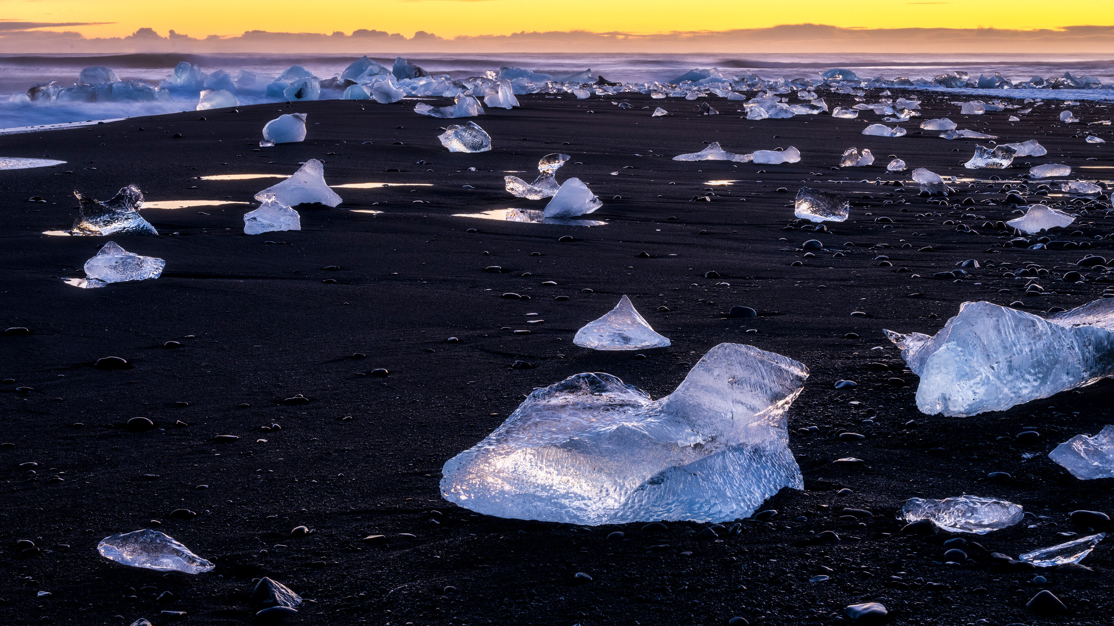 A captivating 4K wallpaper presents Diamond Beach in Iceland, where countless icebergs scatter across the black volcanic sand at sunset. The golden-orange sunset light bathes the distant ocean and horizon, while brilliant blue-white ice fragments sparkle against the dark, wet sand, creating a dramatic interplay of color and texture.