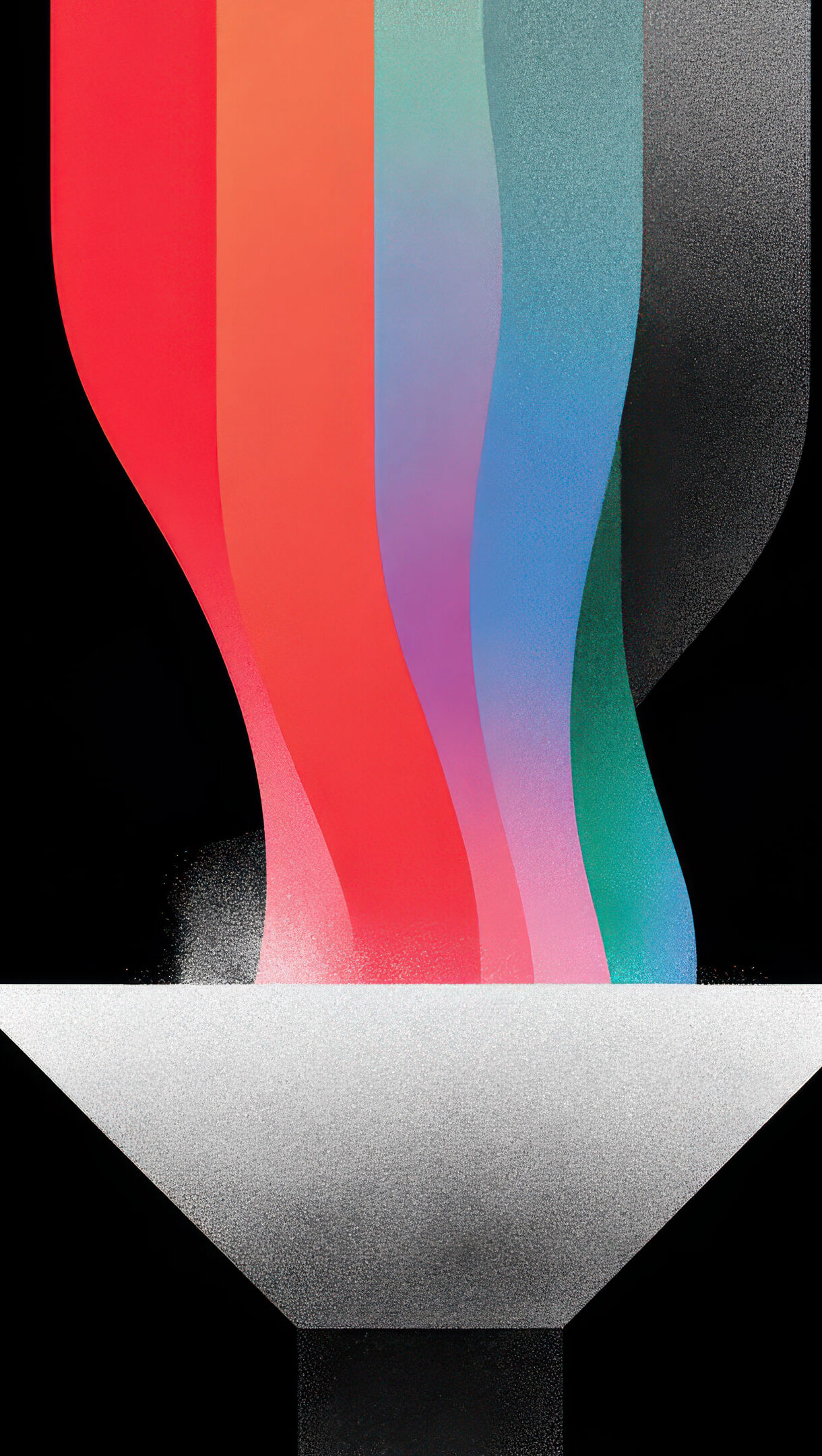 A captivating 4K wallpaper showcases an abstract colorful funnel receiving vibrant, textured bands of color against a stark black background. This compelling digital art features the striking interplay of richly textured, flowing hues into the shimmering, granular funnel, creating a dynamic and modern visual effect.