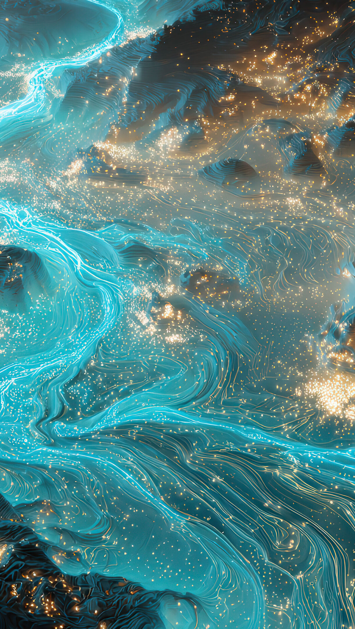 A vibrant 4K wallpaper showcasing a luminous blue river flowing through a dark, abstract landscape detailed with golden light particles. The brilliant turquoise current sparkles and swirls, creating a striking contrast with the surrounding textured terrain and scattered points of warm, glowing light.