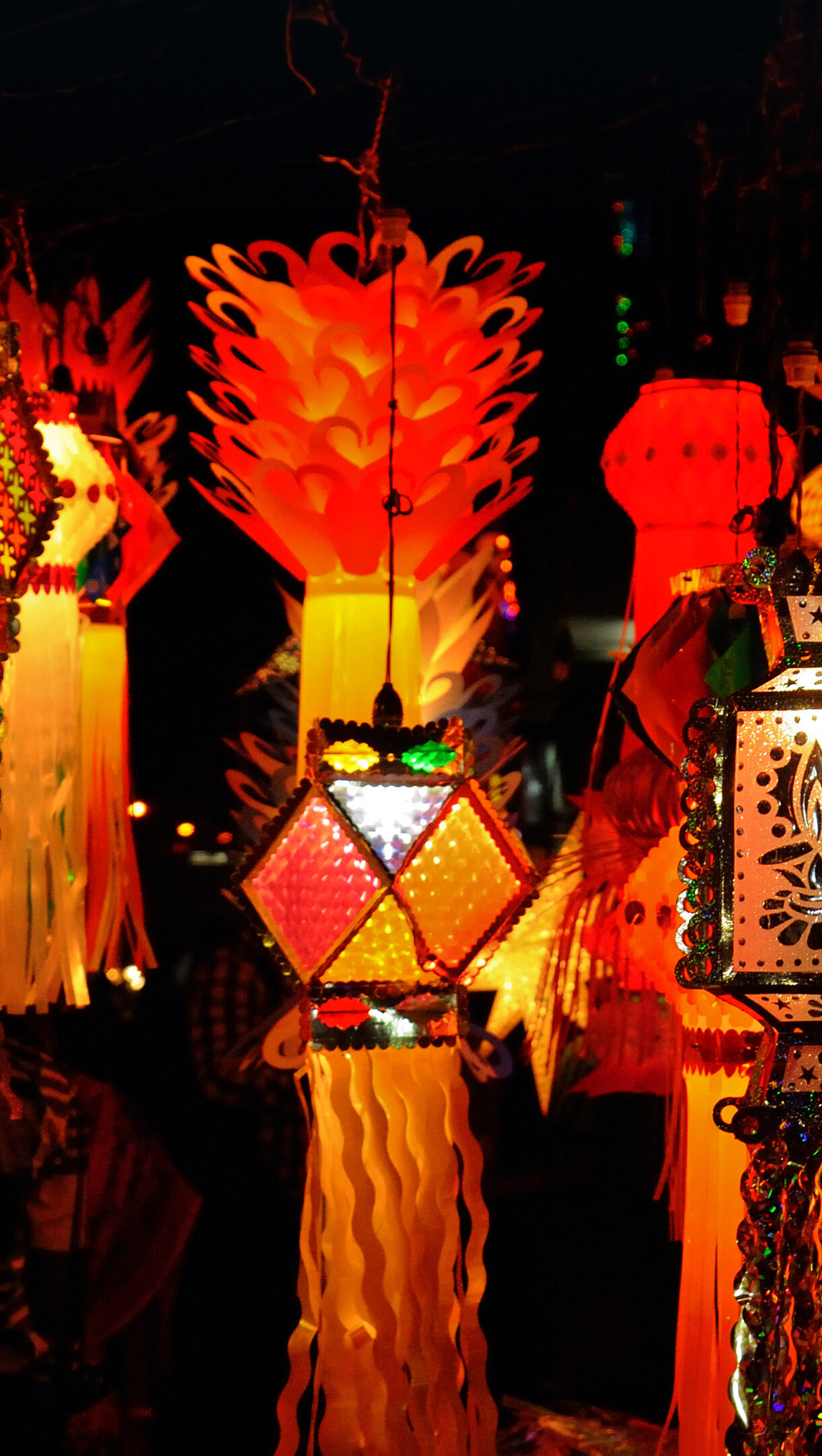 An enchanting 4K wallpaper showcasing numerous colorful illuminated Diwali lanterns hanging against a dark night sky in Mumbai, India. Their intricate geometric and floral patterns glow warmly in vibrant reds, oranges, and yellows, casting a festive and celebratory ambiance.