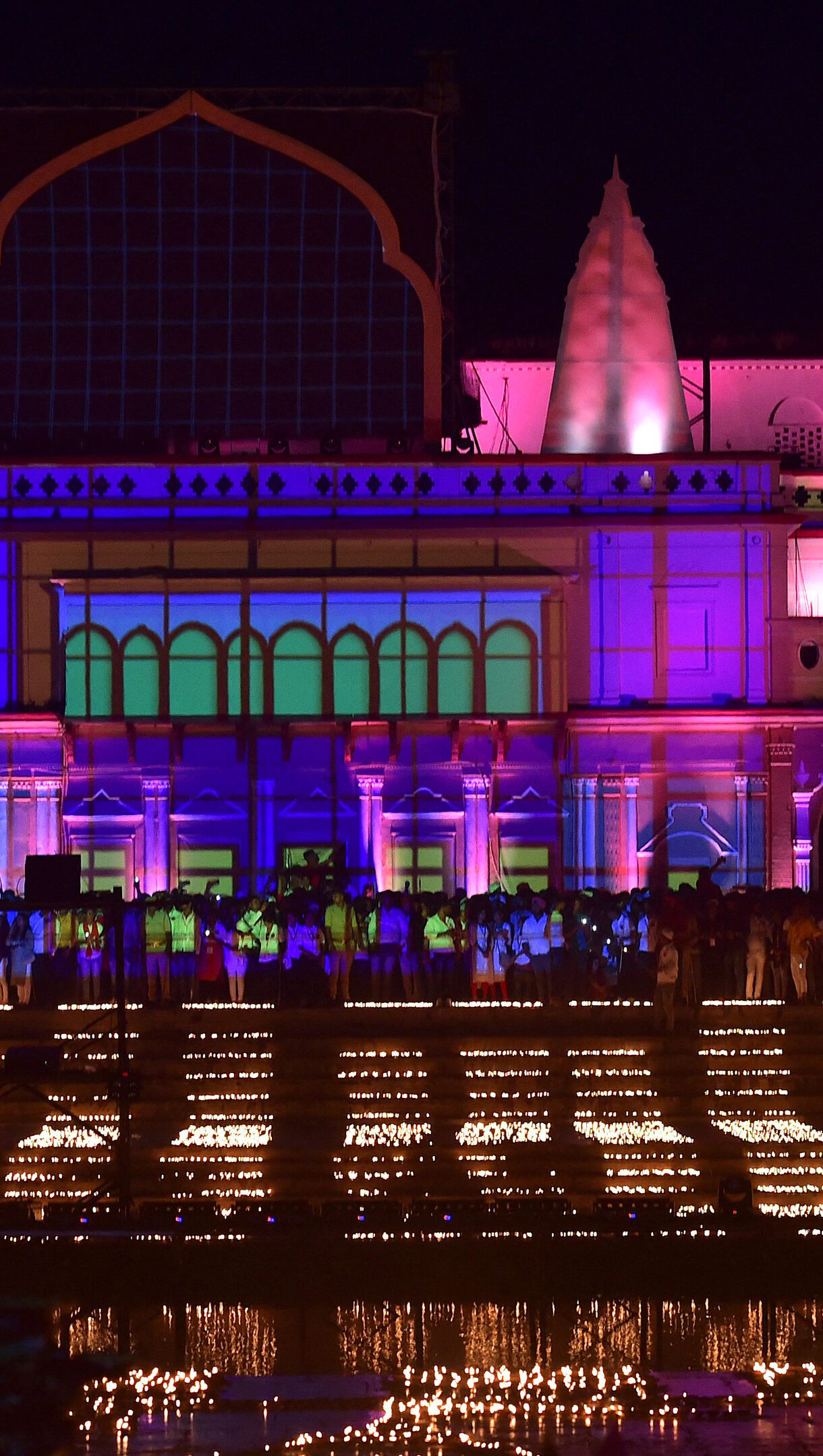 An enchanting 4K wallpaper showcases the festive Diwali celebrations along the Sarayu River banks, centered around a grandly illuminated temple. Thousands of flickering Diwali lamps adorn the river steps and float gracefully on the dark water, their warm glow beautifully reflecting the temple's vibrant purple, pink, and blue lighting.