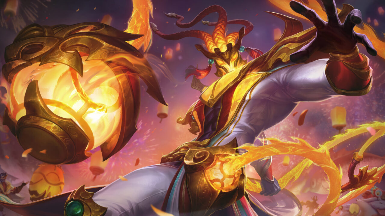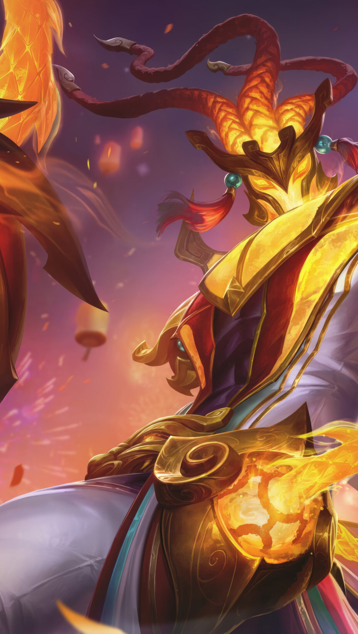 A mesmerizing 4K wallpaper showcasing the Dragon Lantern Thresh skin in Wild Rift. Thresh, the Chain Warden, is depicted in a spellbinding stance adorned with dragon-themed lanterns, emanating an otherworldly glow that adds a touch of mystique to the atmospheric world of Wild Rift. Simply click the download button to bring this masterpiece to life on your screen as a desktop wallpaper or save it for later in your wallpaper collection.