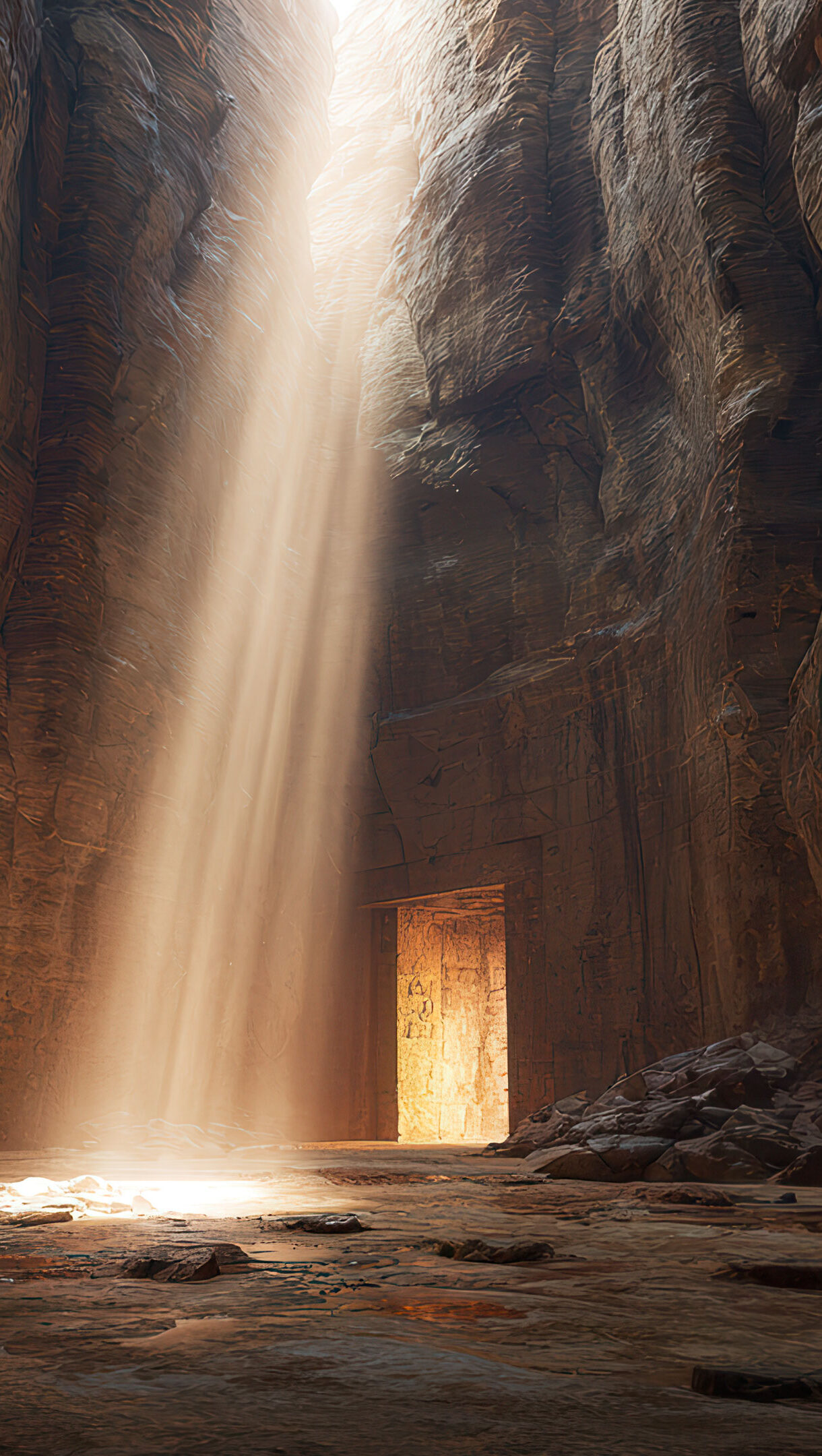 A stunning 4K wallpaper featuring a powerful beam of light descending into a deep, narrow rocky canyon with a carved doorway in the distance. This dramatic illumination contrasts sharply with the dark canyon walls, revealing intricate rock textures and evoking a sense of mystery and awe.