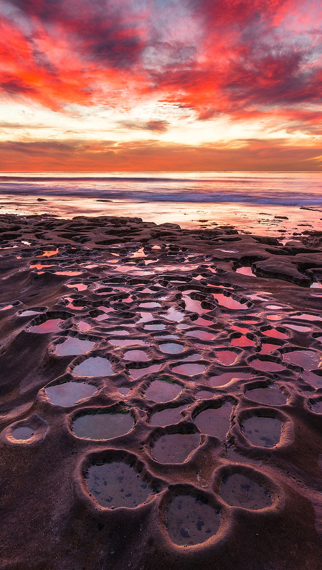 Dramatic Red Sunset Reflected In Coastal Tide Pools