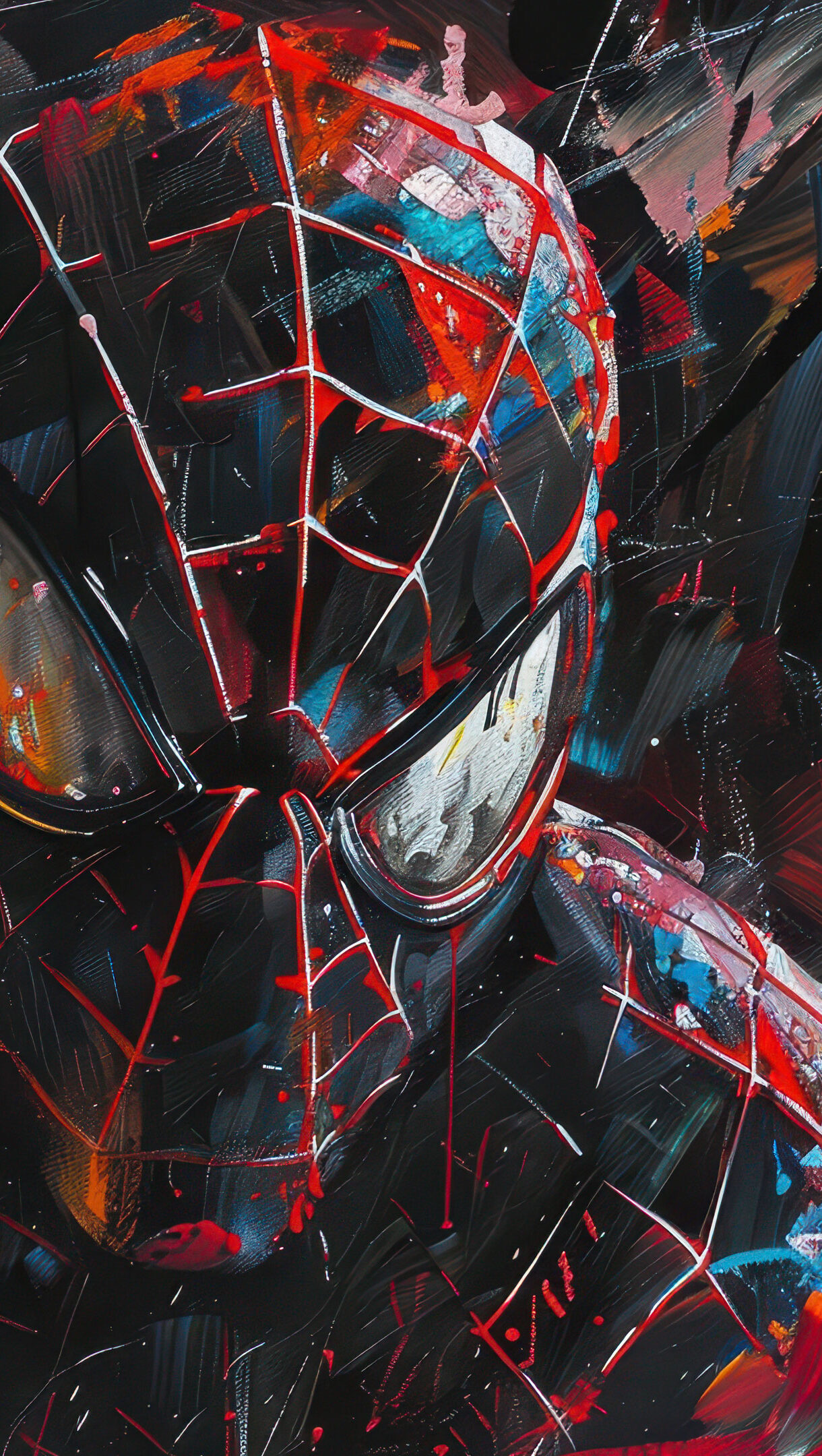 A dramatic 4K wallpaper of a stylized Spider-Man in his black suit, emerging with intensity from an abstract, energetic background. Its vibrant aesthetic, characteristic of expressive digital art, is defined by dynamic, contrasting splashes of red, blue, and orange that create an intense, almost chaotic energy around the hero.