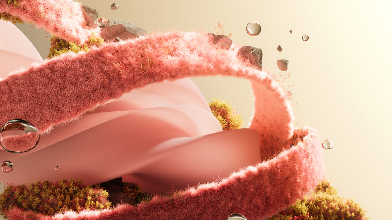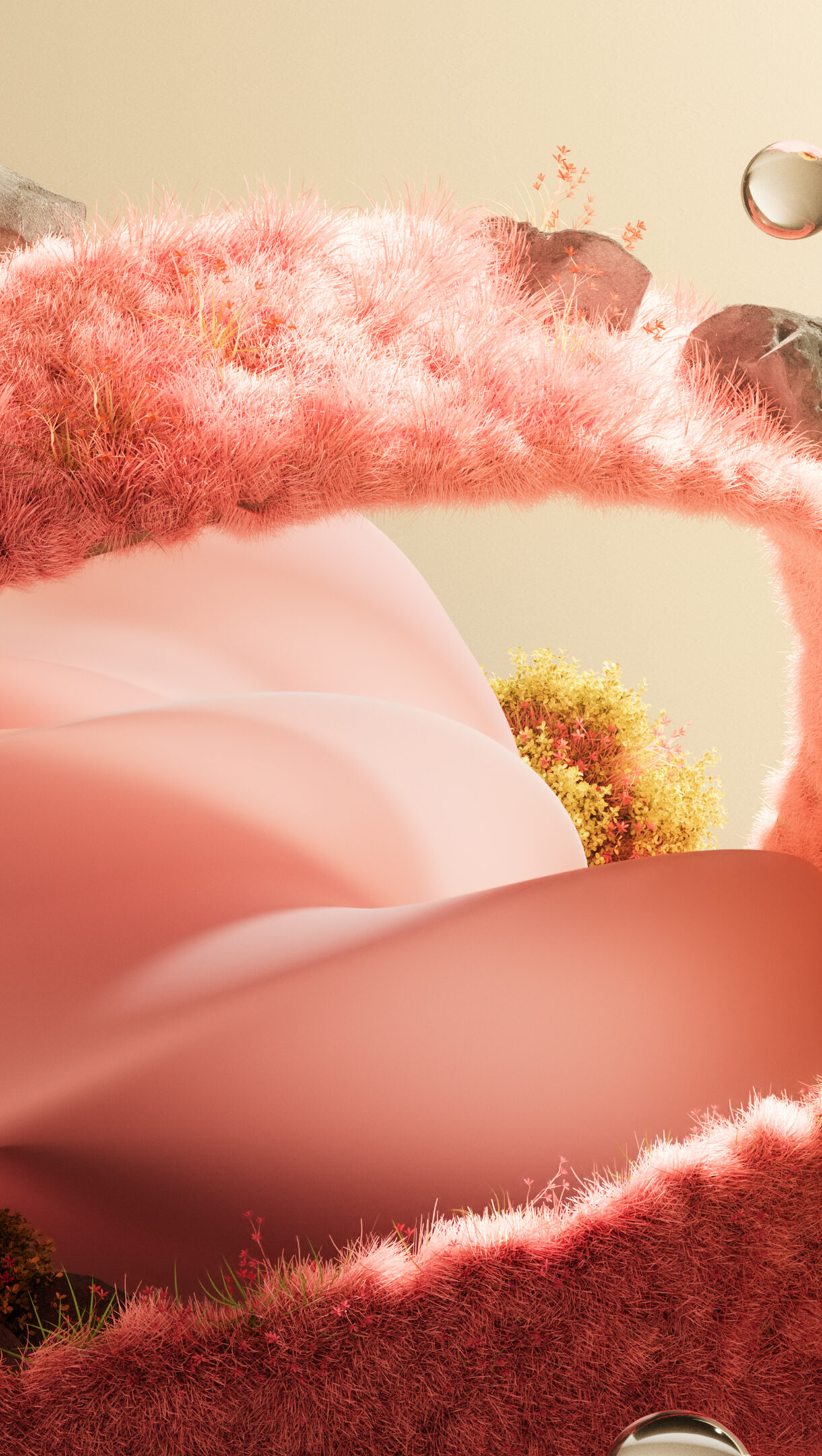 A magical 4K wallpaper showcases a dreamy, swirling landscape where a massive pink fluffy structure winds gracefully through the scene. Its soft, vibrant pink textures are accented by ethereal floating spheres and pockets of golden foliage, creating a serene and otherworldly mood.