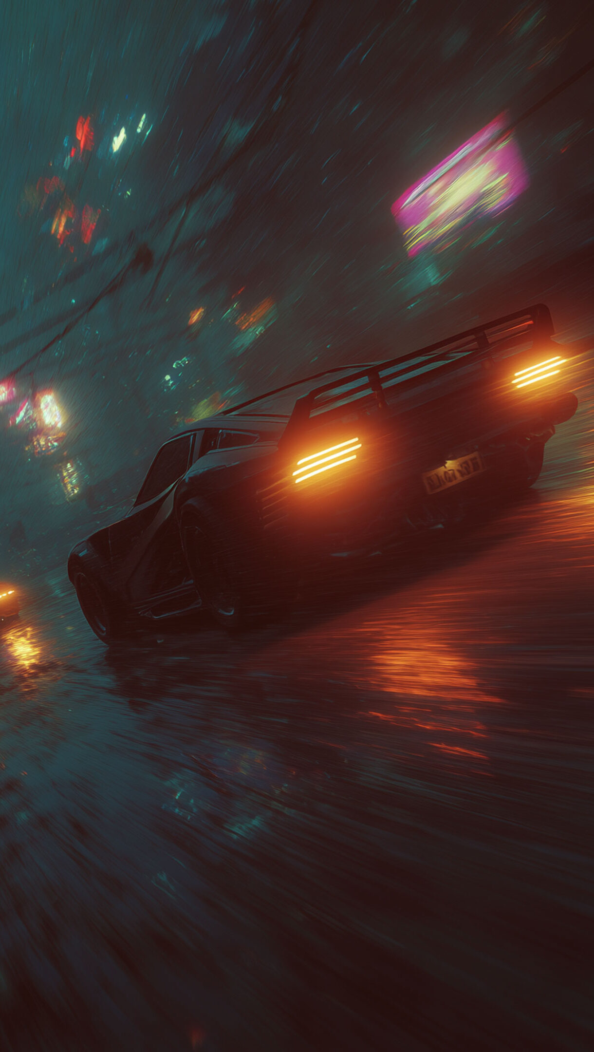 A stunning 4K wallpaper featuring futuristic cars driving at speed through a wet, dark cyberpunk city street at night. The glowing neon lights and vibrant taillights intensely reflect on the dark, wet road surface, enhancing the dynamic speed and atmosphere.