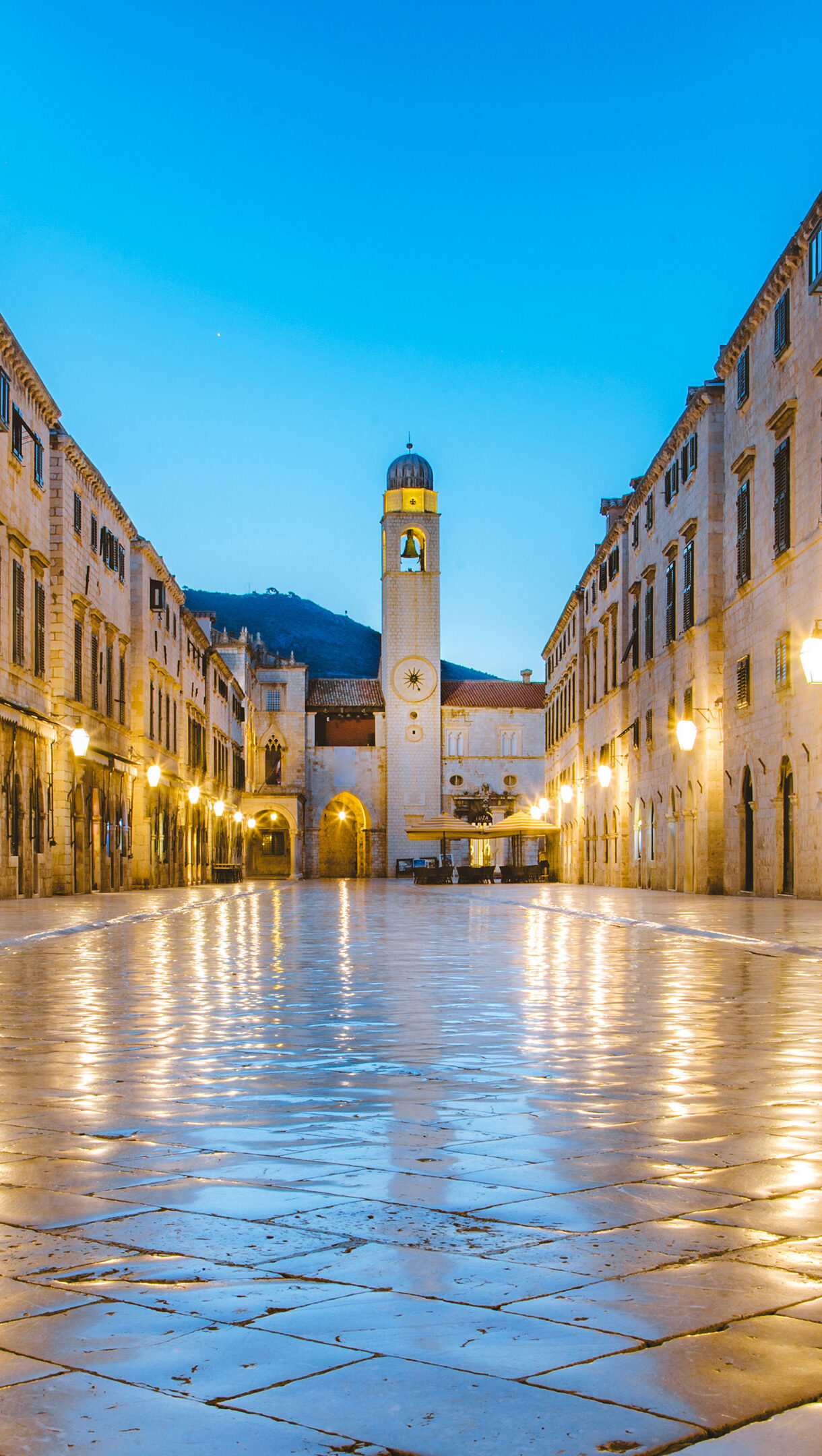 An enchanting 4K wallpaper depicting the iconic Stradun, the main thoroughfare of Dubrovnik's Old City, in the quiet evening. The gleaming stone pavement dramatically reflects the warm light from the ornate street lamps, casting a golden glow that contrasts beautifully with the soft twilight sky.