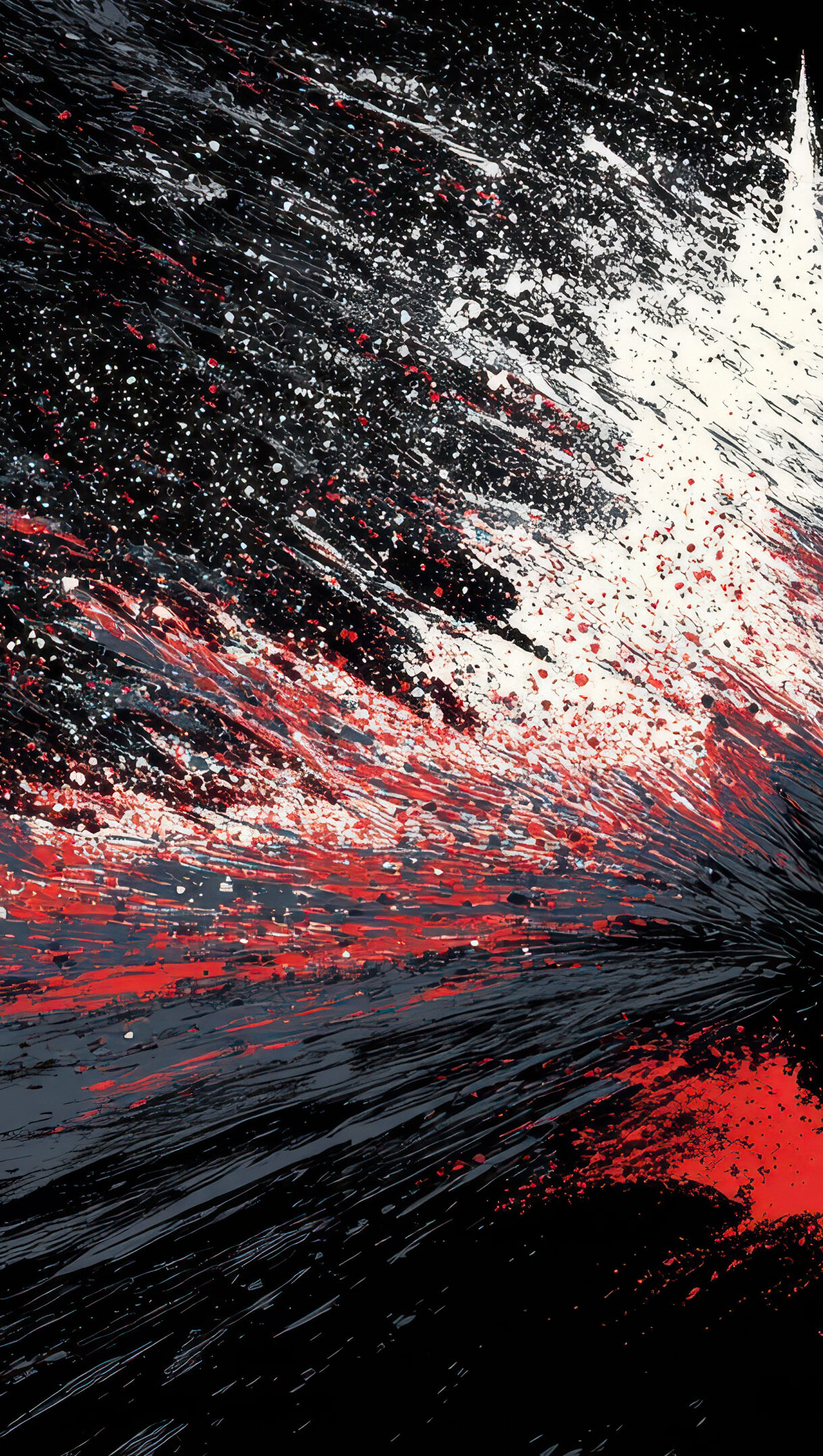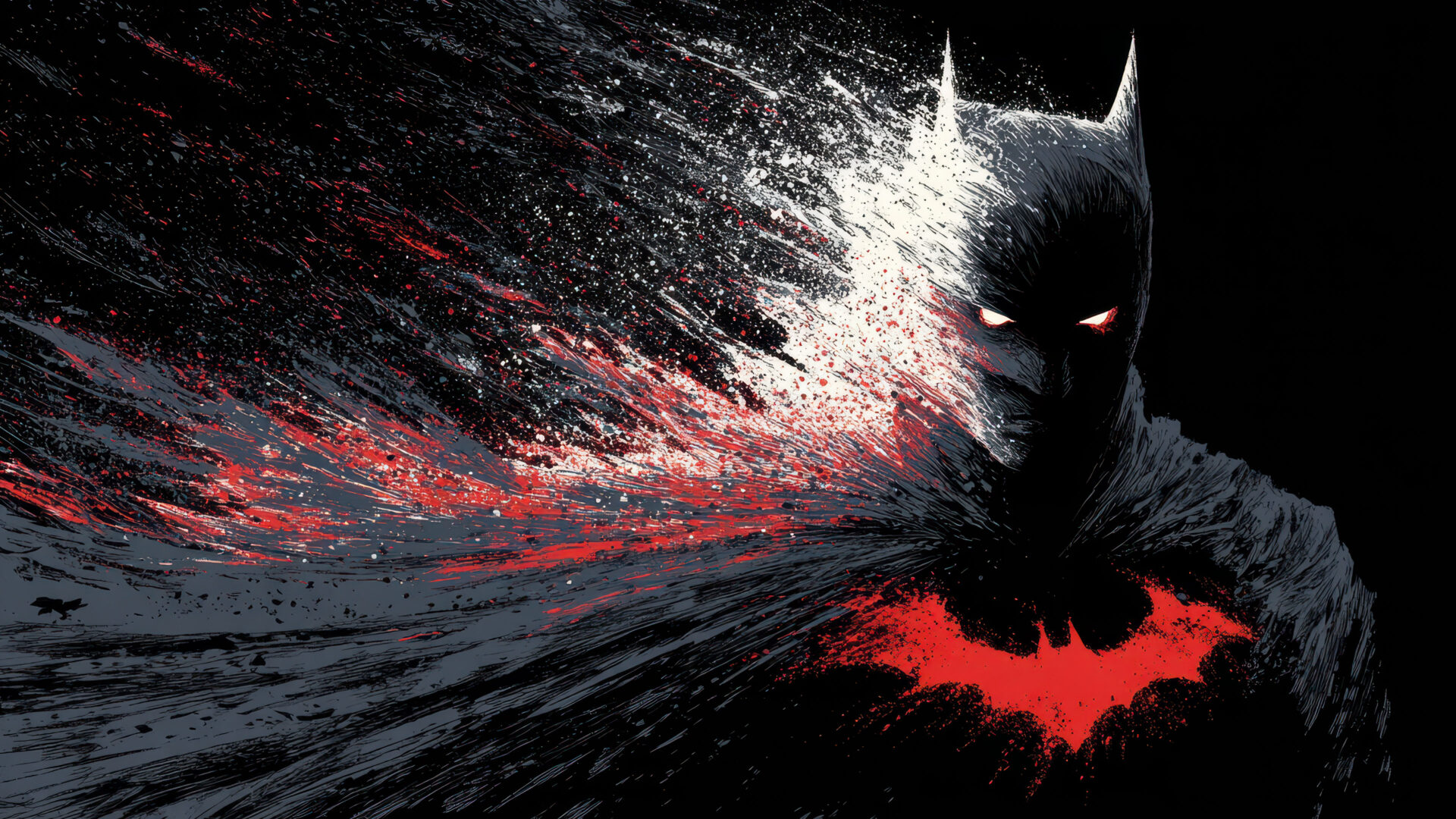 A commanding 4K wallpaper presents Batman, rendered in a dynamic splatter art style, emerging from a dark, abstract setting. His powerful, shadowy form, detailed with white and red splatters that imply motion, is highlighted by glowing red eyes and a prominently splattered red bat symbol on his chest.