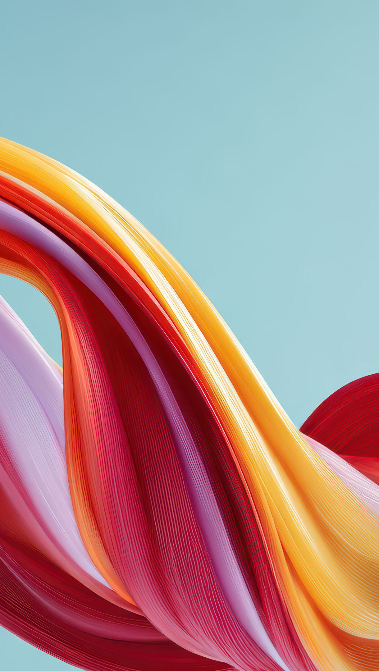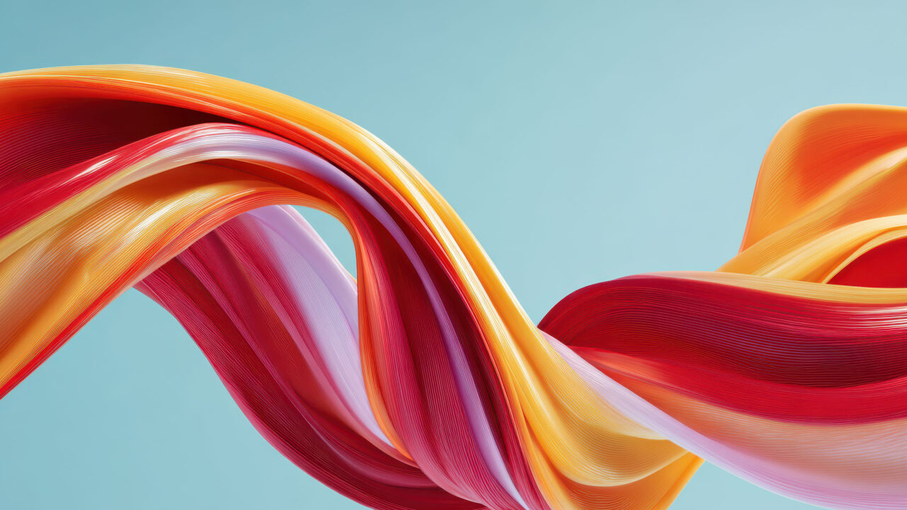 A captivating 4K wallpaper showcasing dynamic, colorful abstract waves flowing across a tranquil blue background. The swirling, ribbed ribbons of red, orange, yellow, and subtle pink hues create a sense of fluid motion and vibrant energy against the serene backdrop.