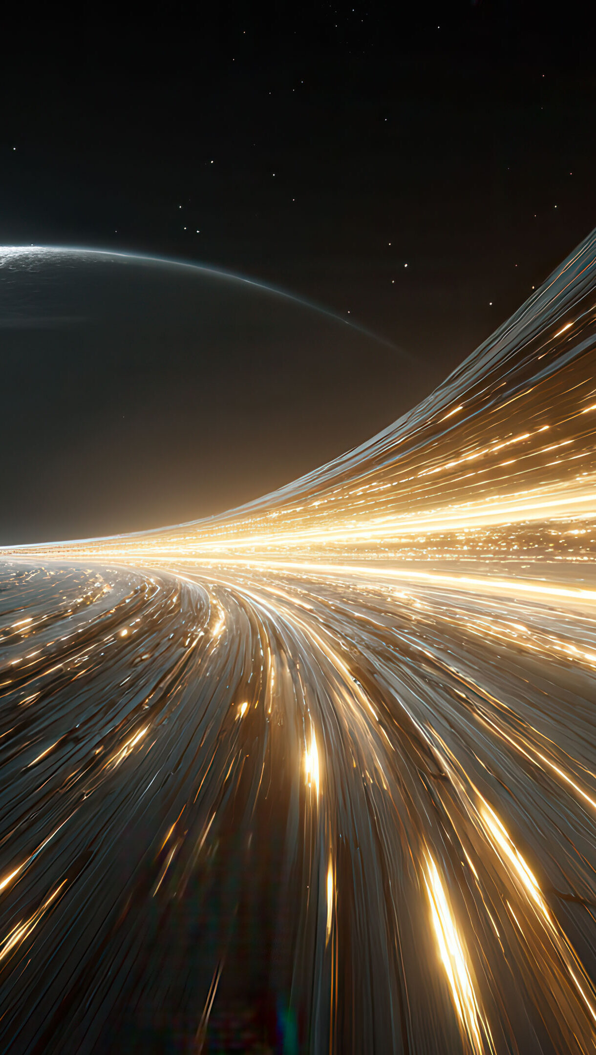 A captivating 4K wallpaper features a luminous, partially illuminated celestial body against a star-speckled dark cosmos, with a dynamic, curved river of brilliant golden light flowing past it and stretching into the distance. The vibrant golden streaks, resembling a cosmic data stream or warp tunnel, intensely contrast with the deep blue-black void, evoking a mood of awe and futuristic speed.