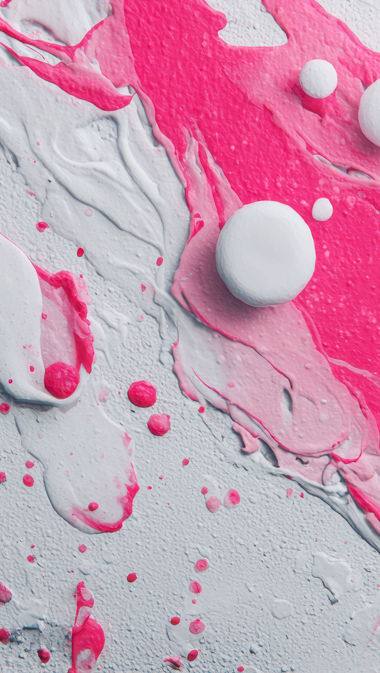 A captivating 4K wallpaper showcases a dynamic abstract composition featuring vibrant pink and textured white paint, emphasizing its fluid and expressive forms. Thick streams and delicate splatters of fuchsia intertwine with the coarse white background, adorned with smooth, contrasting white spheres that add three-dimensional depth and accentuate the energetic flow.