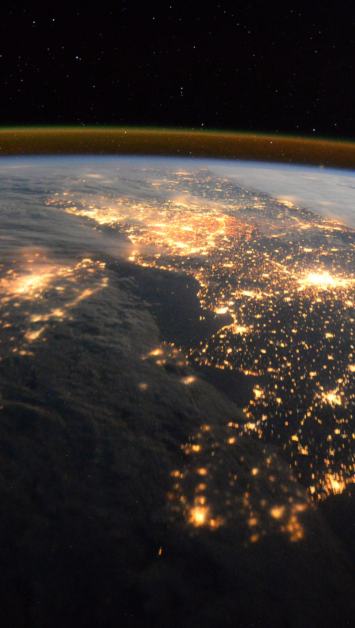 An awe-inspiring 4K wallpaper capturing Earth at night from the International Space Station, revealing vast networks of city lights across continents. These brilliant golden clusters dramatically illuminate the darkened landmasses, creating a mesmerizing interplay of human presence against the deep cosmic expanse and the glowing atmospheric edge.