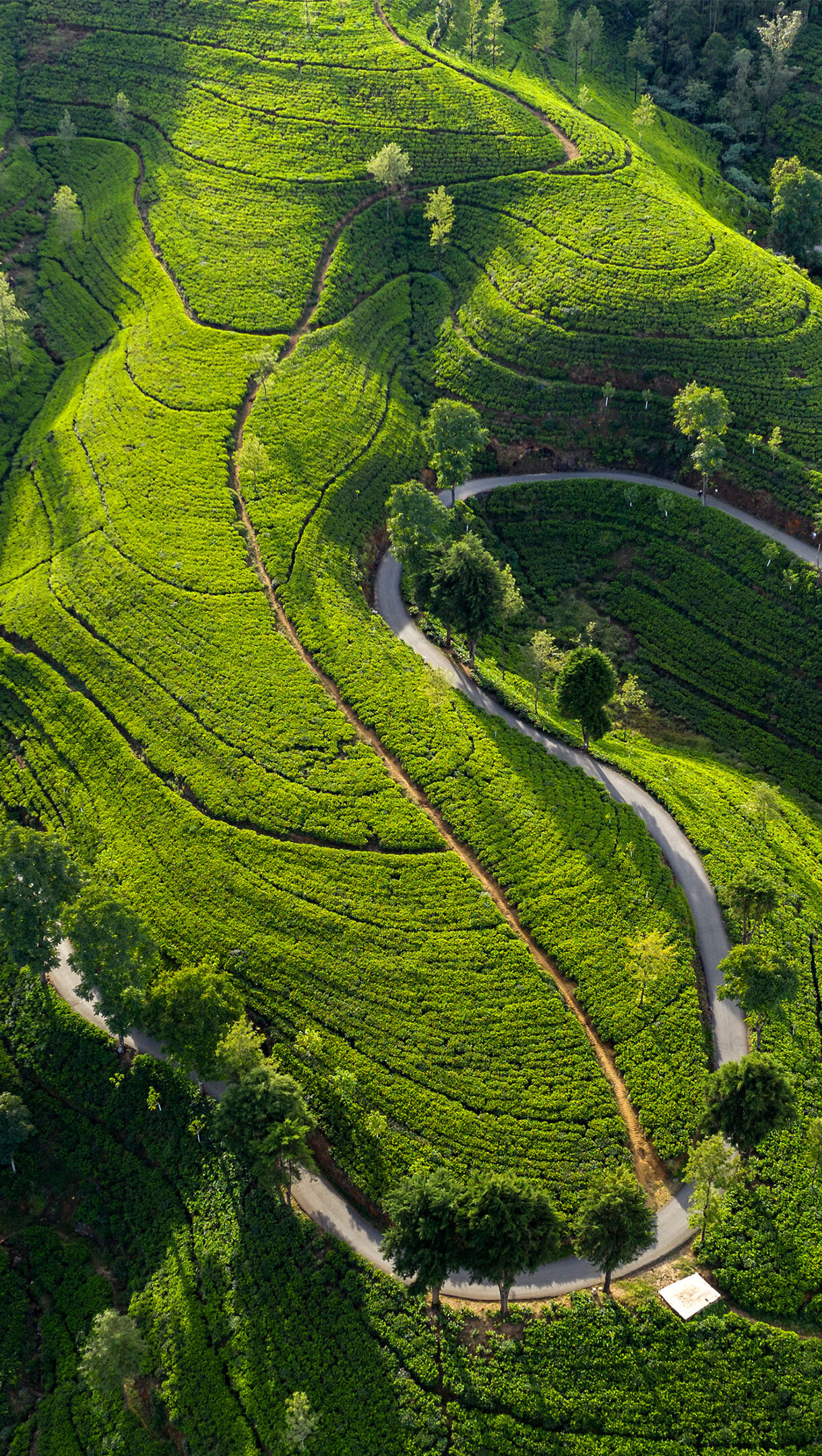 An immersive 4K wallpaper showcasing the Edinburgh Tea Estate in Nuwara Eliya, Sri Lanka, depicts vast green terraced plantations from an aerial perspective. Sunlight dramatically illuminates the lush, vibrant tea bushes, emphasizing the intricate contours of the terraced hills and the winding paths that define this iconic landscape.