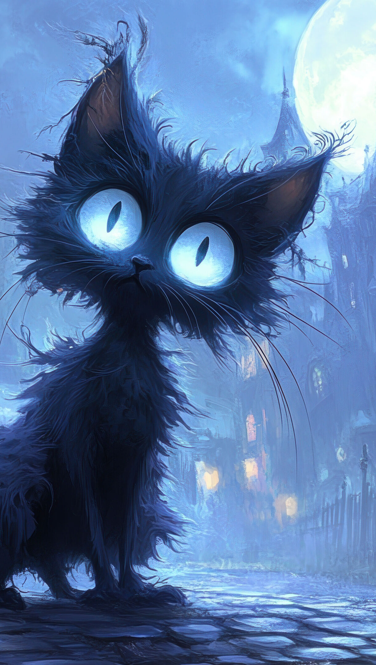 A haunting 4K wallpaper featuring an eerie black cat with glowing eyes, set against a dark and mysterious background. The cat's intense gaze and shadowy fur create a chilling yet mesmerizing atmosphere, making it perfect for fans of gothic, supernatural, or Halloween-themed aesthetics. Simply click the download button to bring this masterpiece to life on your screen as a desktop wallpaper or save it for later in your picture collection.