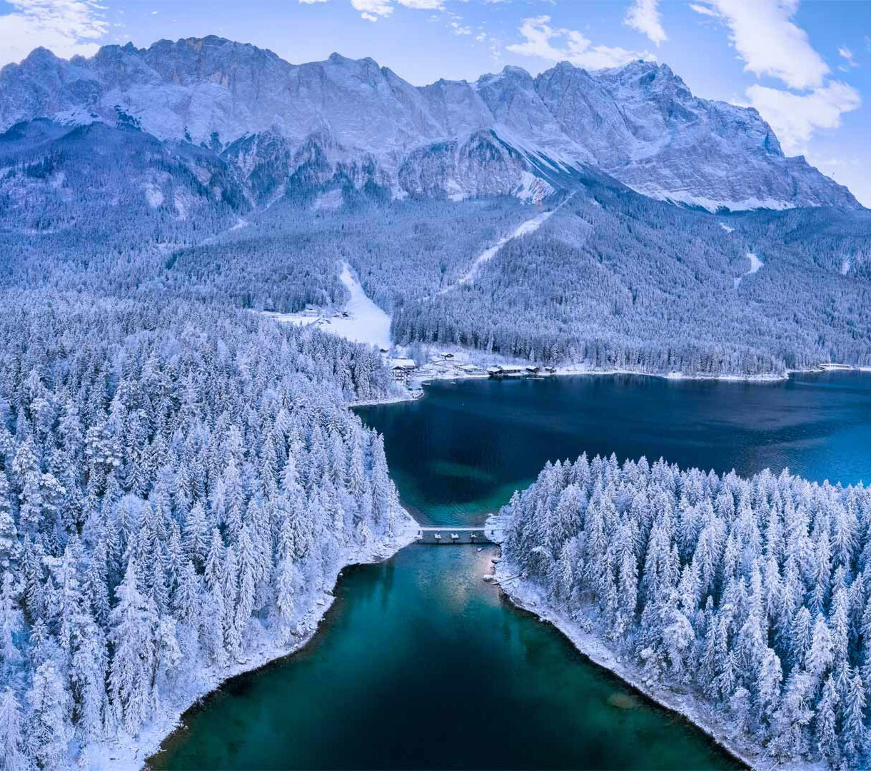 A breathtaking 4K wallpaper capturing the serene Eibsee Lake winter landscape in Bavaria, flanked by a snow-covered forest and the majestic Zugspitze Mountain. The deep, clear turquoise of Eibsee Lake beautifully contrasts with the pristine white of the extensive snow-covered forest and the majestic, icy peaks of the Zugspitze, creating an atmosphere of stunning winter tranquility.