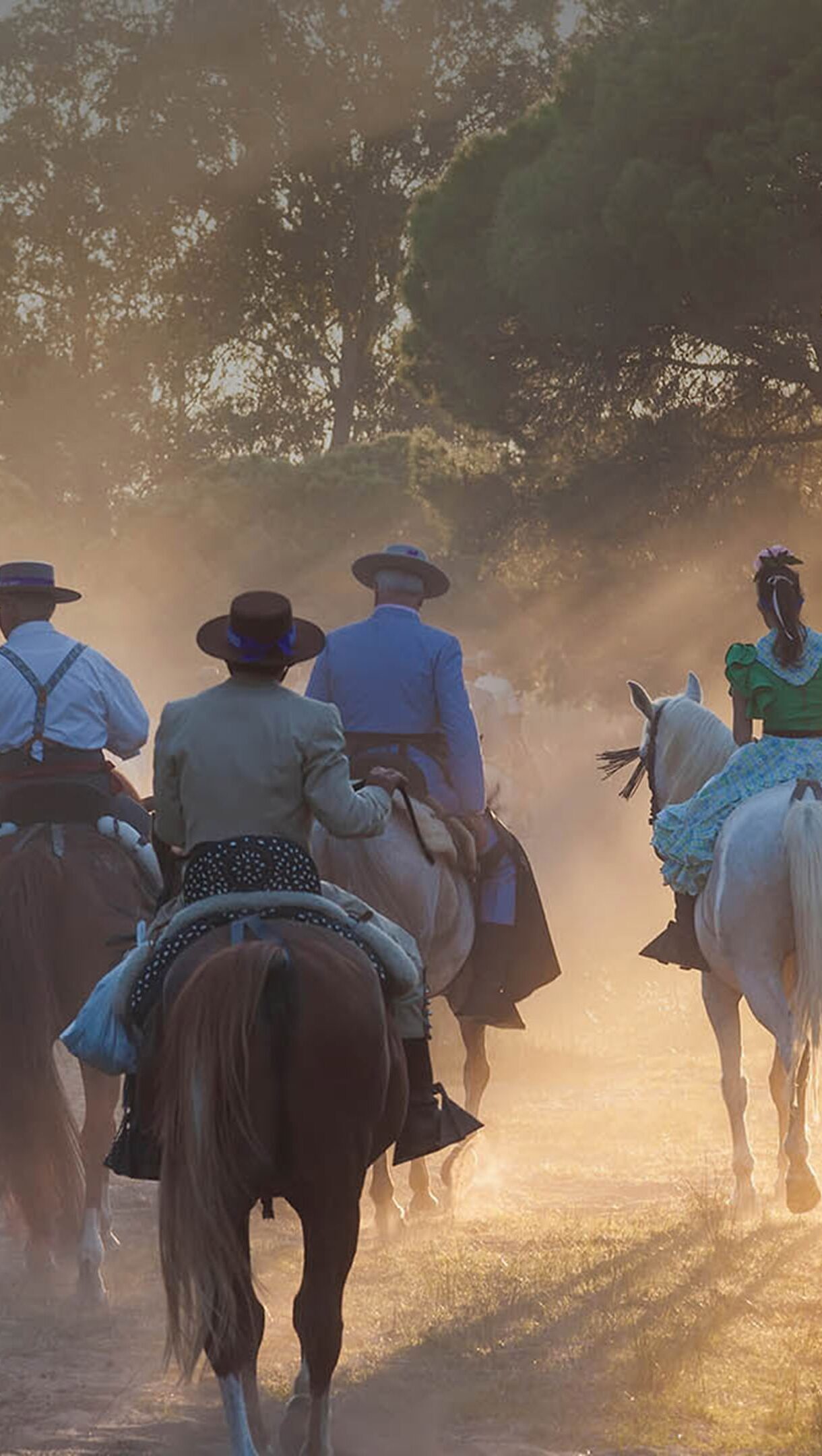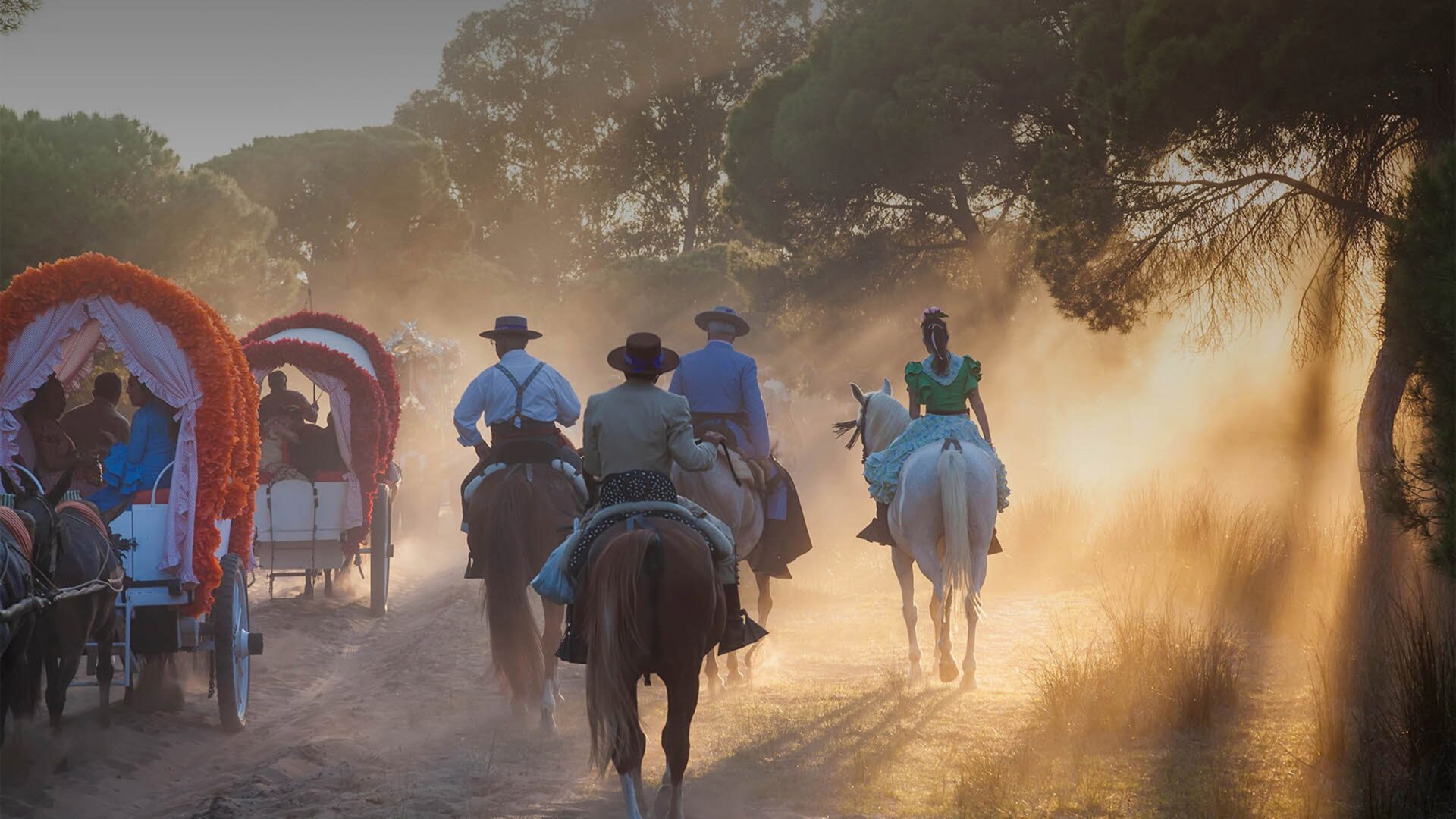 A captivating 4K wallpaper showcasing the vibrant atmosphere of the El Rocío pilgrimage. Immerse yourself in the cultural celebration and traditional event with this high-resolution depiction. Simply click the download button to bring this masterpiece to life on your screen as a desktop wallpaper or save it for later in your picture collection.