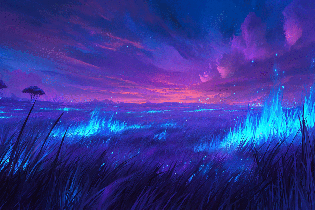 A mesmerizing 4K wallpaper showcasing a vast field of dark purple grass under an expansive twilight sky with hues of blue, purple, and pink. Vivid electric blue flames dance across the foreground and midground, their intense glow creating a striking contrast with the shadowy landscape and infusing the scene with an ethereal, magical ambiance.