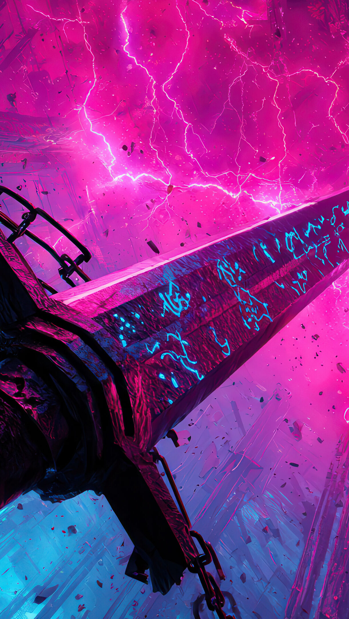 An electrifying 4K wallpaper showcases a massive, dark sword, adorned with glowing blue runic inscriptions, standing amidst a swirling vortex of fragmented debris. Intense, crackling pink lightning illuminates the background, dramatically contrasting with the cooler blue light reflecting off the shattered elements and defining a powerful, mystical mood.