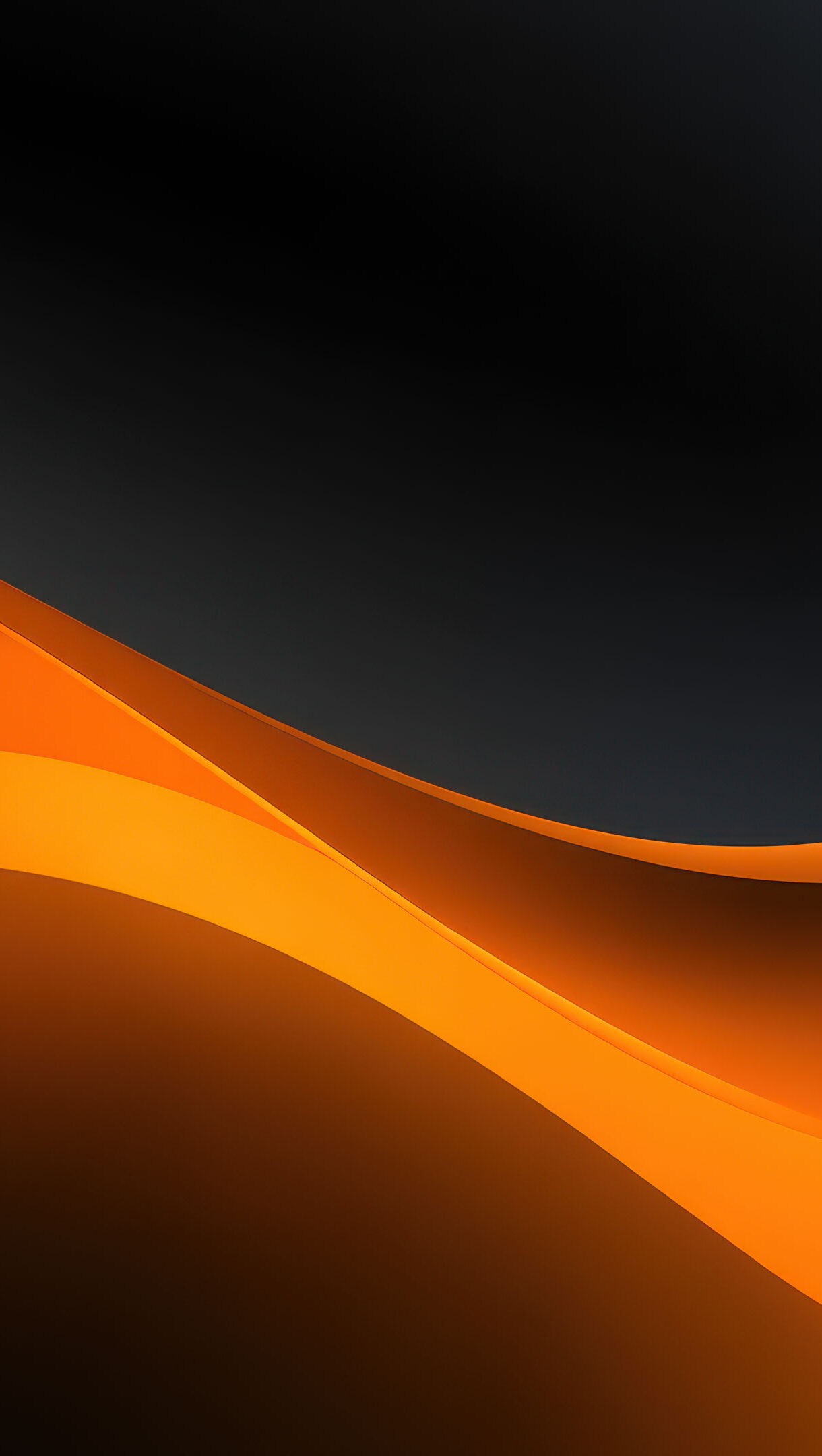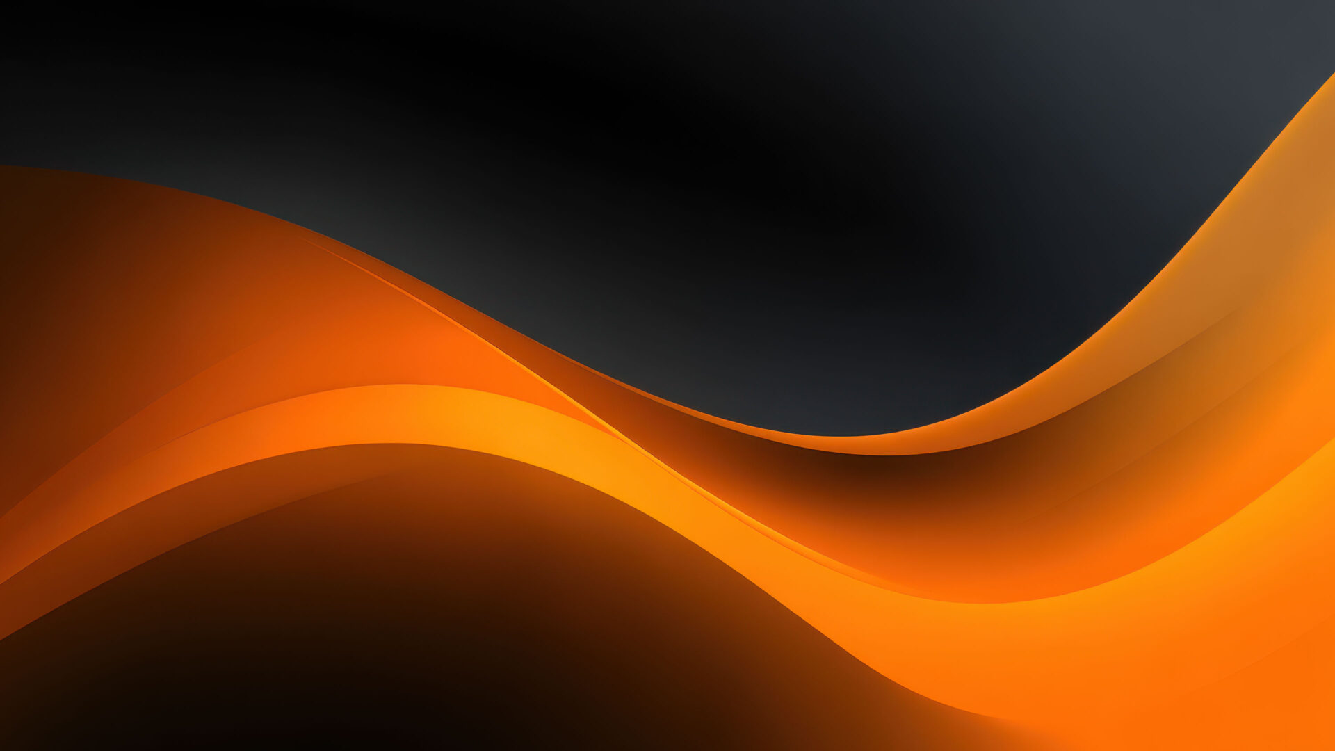 A mesmerizing 4K wallpaper showcases elegant abstract orange waves gracefully flowing across a deep, dark background. The dynamic curves feature luminous orange gradients that seamlessly blend into the dark depths, creating a sophisticated and fluid visual experience.