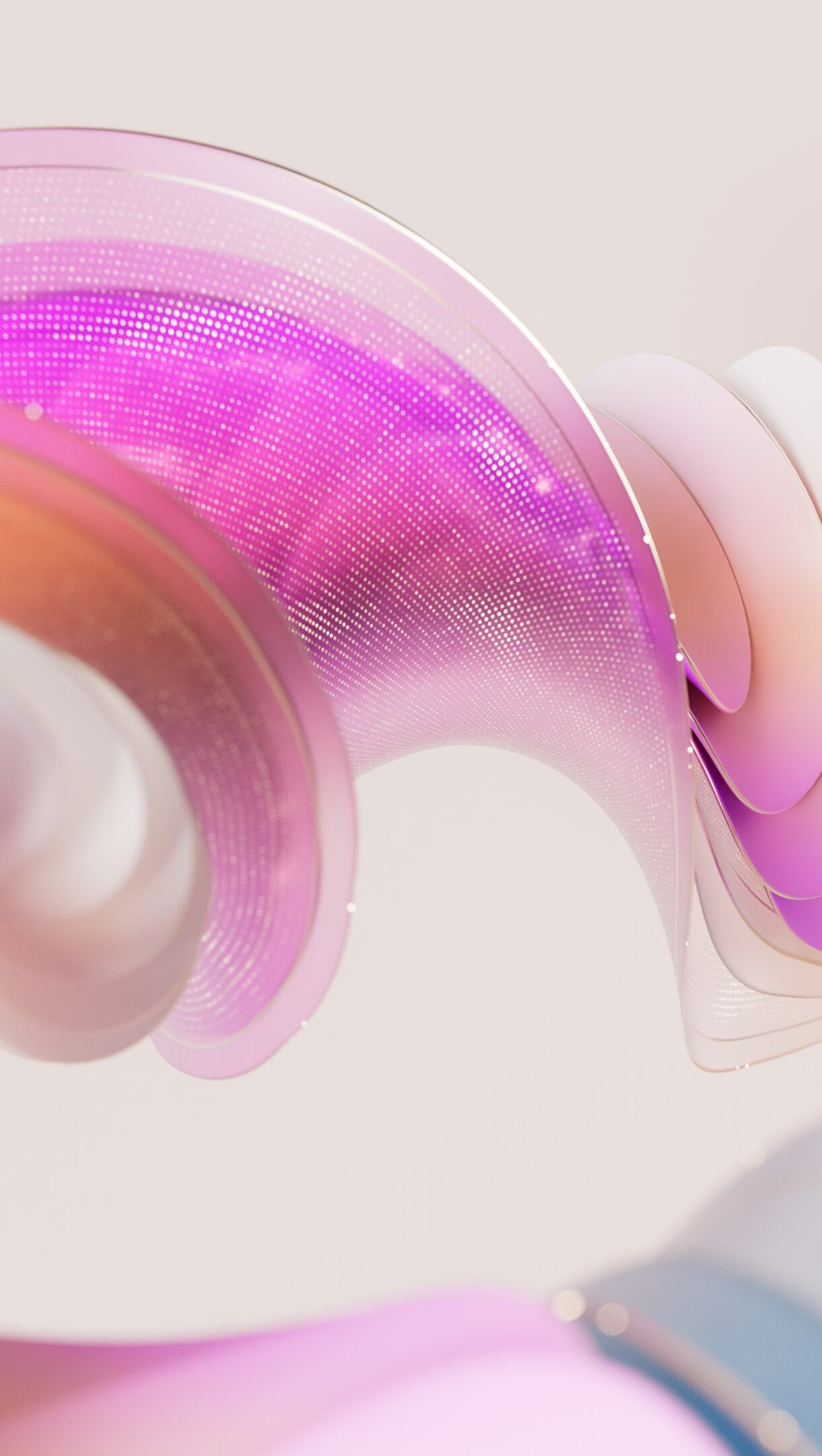 An elegant 4K wallpaper showcasing a graceful 3D twisted ribbon, unfolding in soft pastel gradients against a light, airy background. Its undulating forms display shimmering sections of vibrant magenta and cool blue, interspersed with creamy white and delicate peach tones, creating a serene and sophisticated abstract composition.