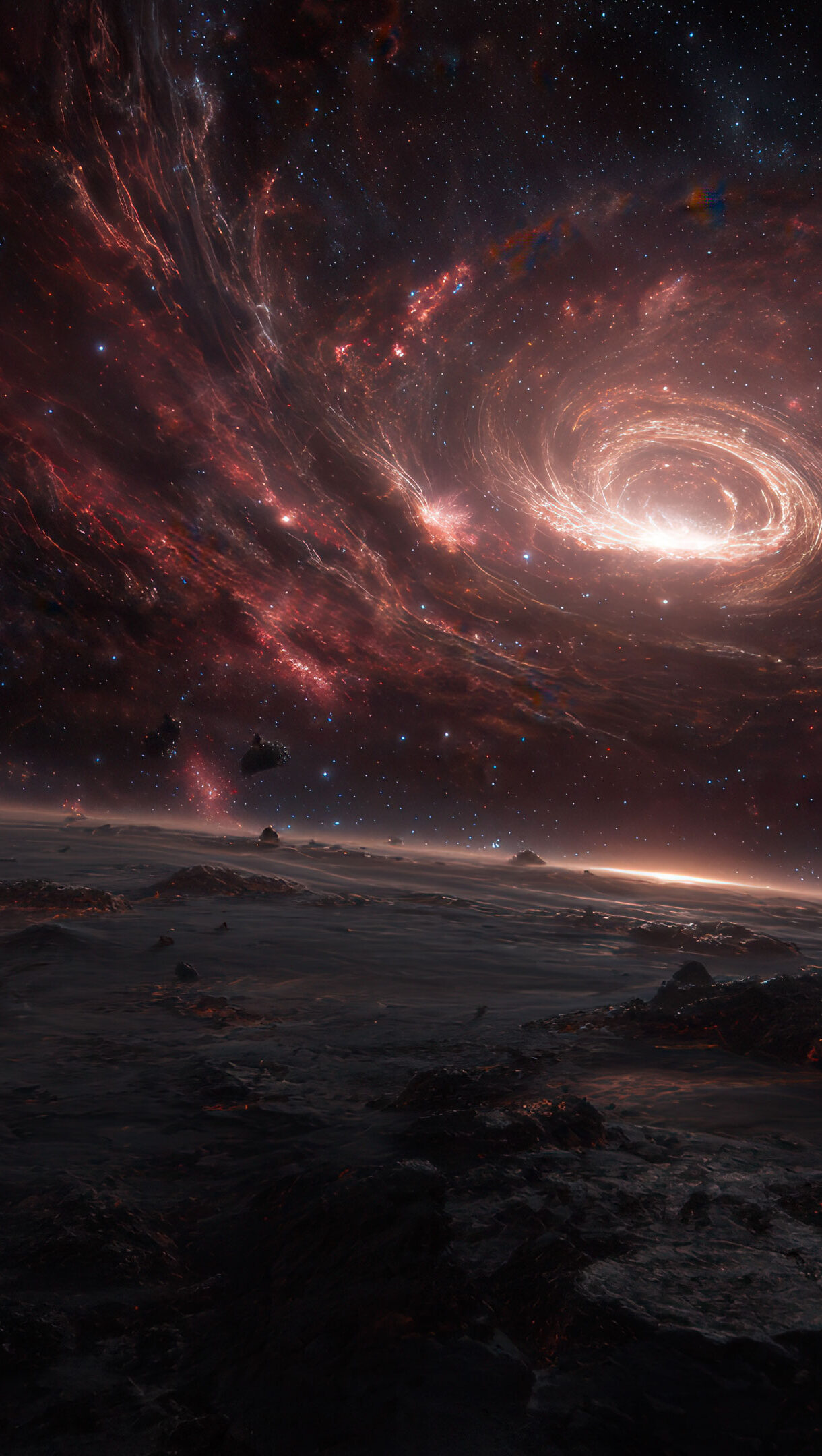 A magical 4K wallpaper reveals a magnificent crimson galaxy vortex with a searing bright core, observed from the rugged, dark surface of an alien planet. The deep reds and oranges of the swirling cosmic energy brilliantly illuminate the shadowed, asteroid-strewn void, creating an awe-inspiring and profound sense of otherworldly grandeur.
