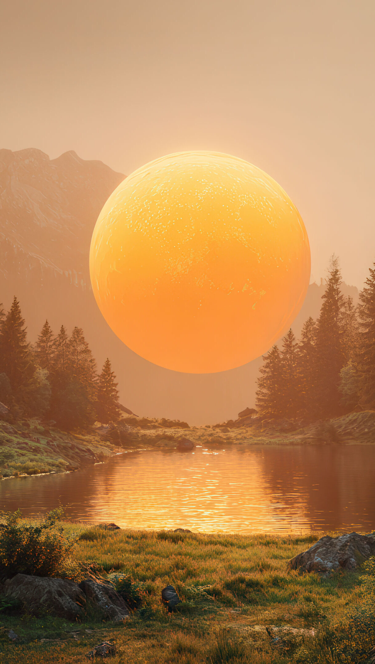 An enchanting 4K wallpaper capturing a colossal, luminous orange sphere suspended above a serene mountain lake, nestled amidst lush pine forests and shadowed peaks. The sphere's intense, warm glow radiates across the tranquil water, illuminating the surrounding foliage with a vibrant golden hue that imbues the scene with a magical atmosphere.