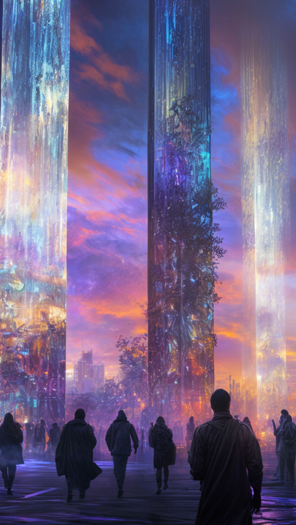 A mesmerizing 4K wallpaper featuring epic fantasy glow pillars towering over a crowd in a mystical setting. The glowing pillars illuminate the scene, casting dramatic light across the fantastical landscape, creating a magical atmosphere perfect for your desktop or mobile background.