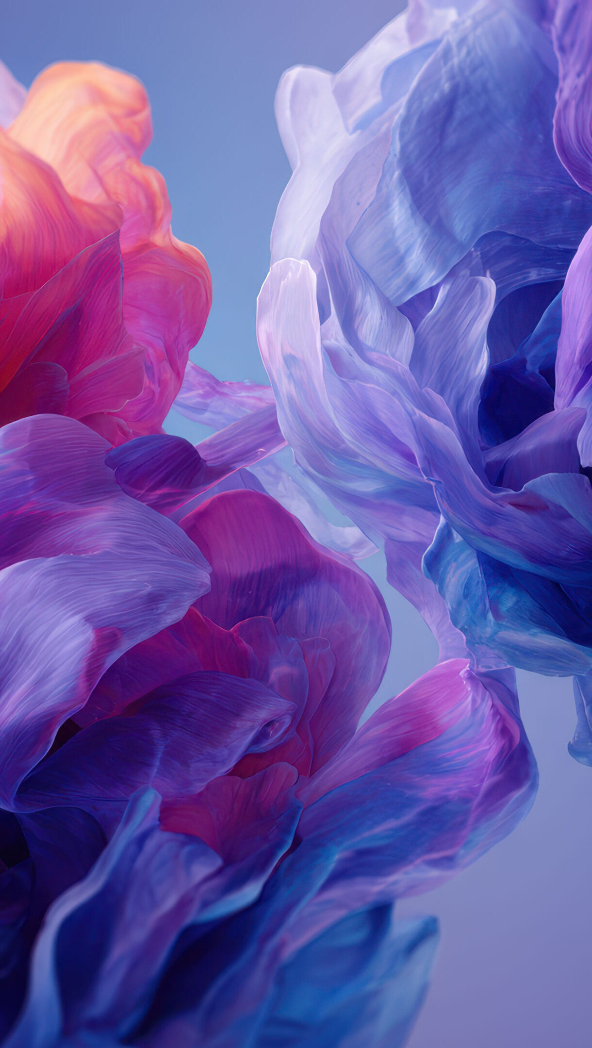 A vibrant 4K wallpaper showcasing two large, abstract masses of flowing fabric swirls, suspended against a soft gradient background shifting from light blue to deep lavender. The delicate, translucent layers of pink, purple, and blue fabric glow with an ethereal light, creating a serene and captivating dreamlike effect.