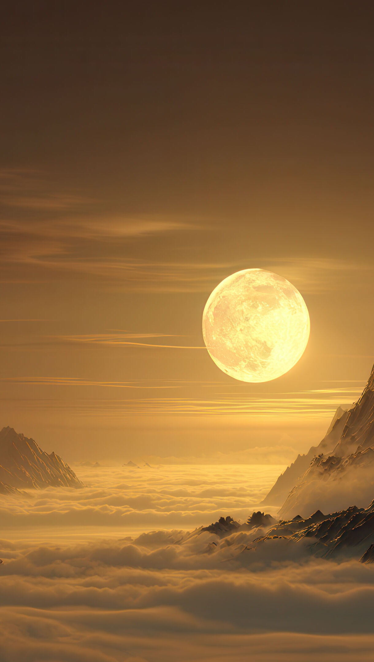 An ethereal 4K wallpaper showcasing a large, golden full moon presiding over a dramatic landscape of sharp mountain peaks emerging from a dense sea of golden mist. The brilliant moon casts a warm, ethereal glow that illuminates the sprawling golden mist below and creates stark, radiant highlights on the rugged, dark mountain ridges, evoking a sense of majestic serenity.