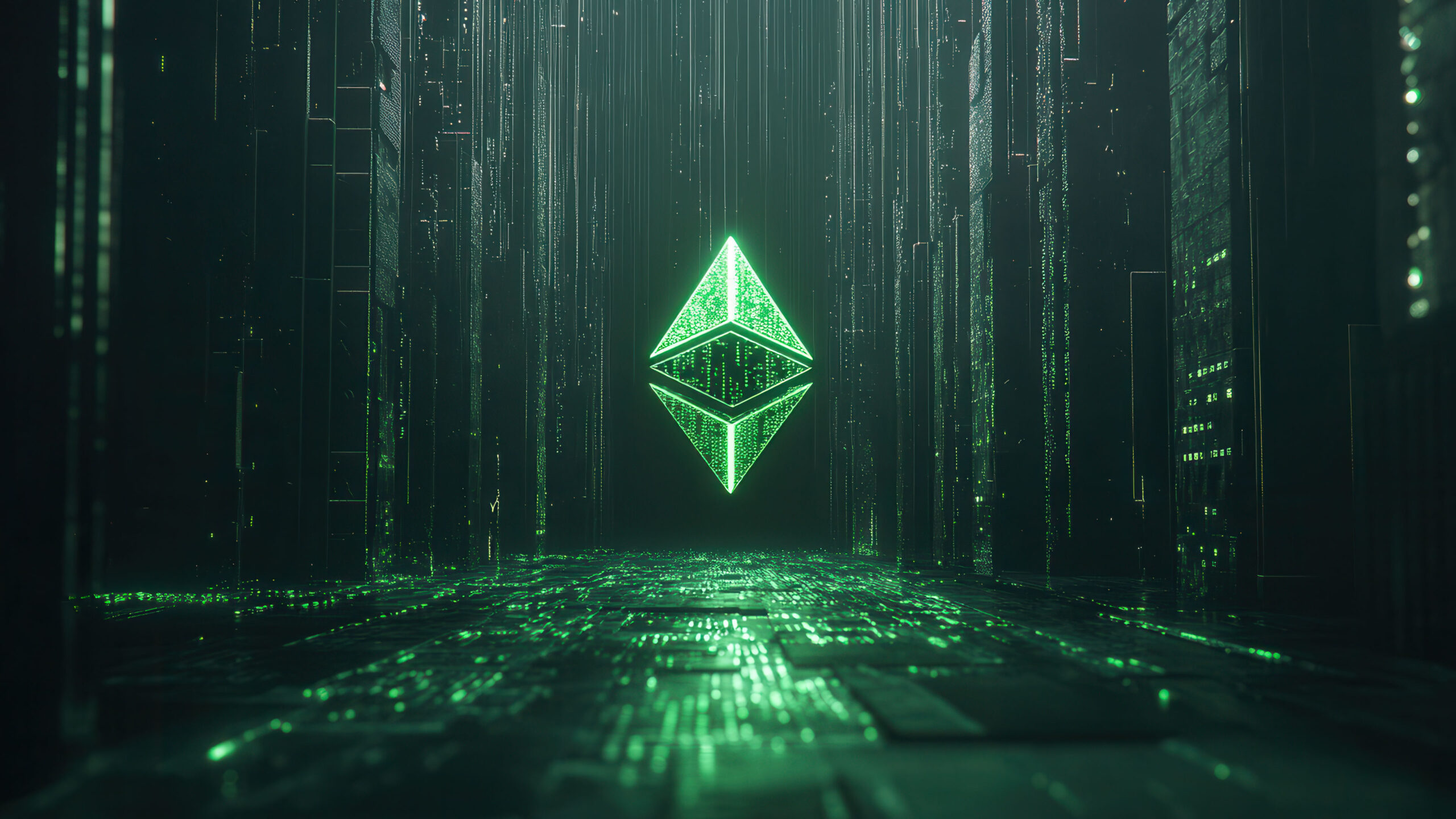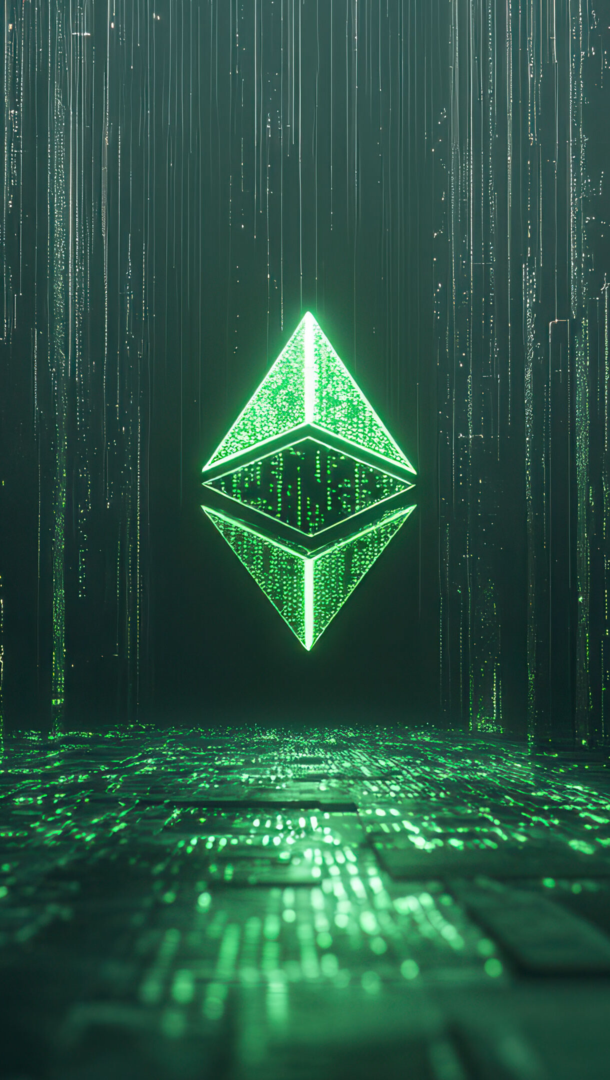 A stunning 4K wallpaper featuring the Ethereum symbol illuminated against a futuristic digital matrix background. The neon-lit blockchain-inspired design creates a high-tech, cyberpunk aesthetic, making it a perfect choice for cryptocurrency enthusiasts and technology lovers alike.