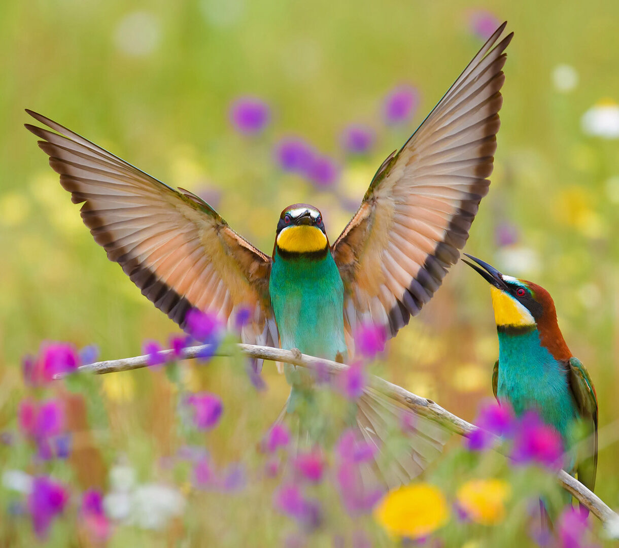 A magnificent 4K wallpaper displaying two vibrant European Bee-eaters with wide open wings amidst a colorful Extremadura wildflower field. The central bee-eater's dazzling plumage, with wings fully unfurled, bursts with brilliant blues, greens, and yellows, creating a striking contrast against the soft, bokeh-blurred foreground of purple and yellow blossoms.