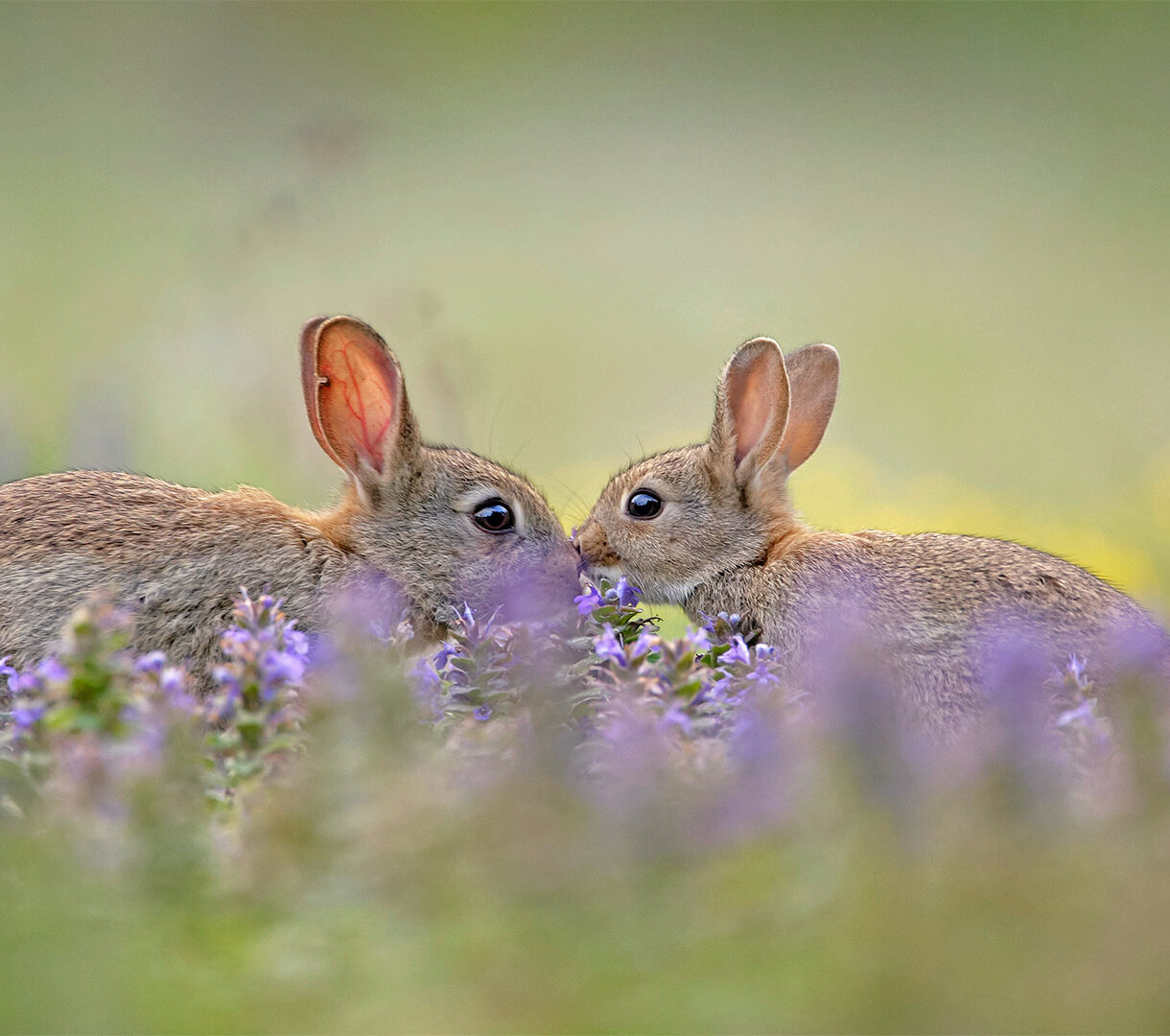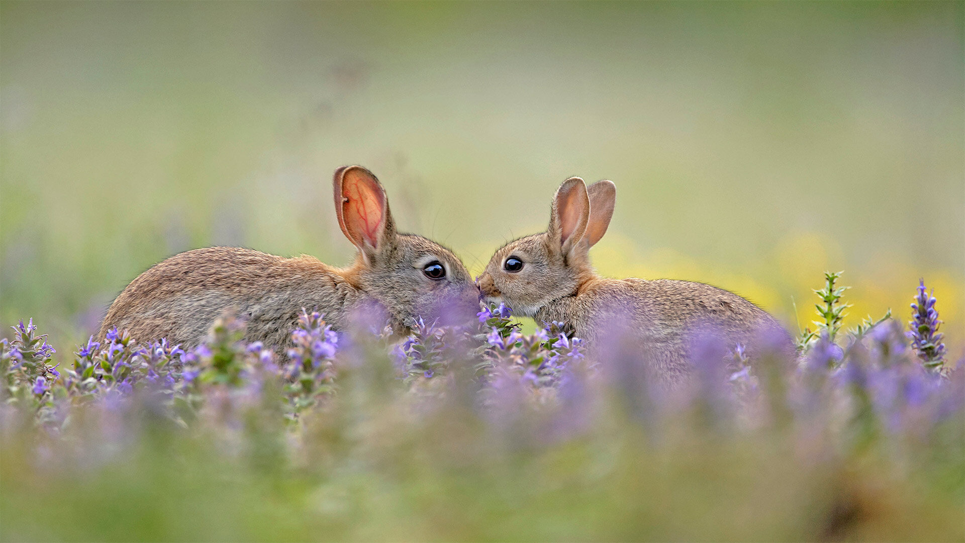A heartwarming 4K wallpaper capturing a European Rabbit kit affectionately greeting its parent amidst a field of vibrant purple flowers in France. Their soft noses touch gently, enveloped by the rich violet blooms that create a tender and intimate scene.