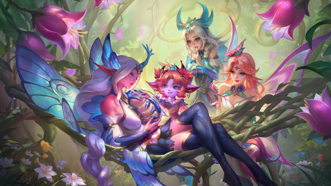 A vibrant 4K wallpaper showcasing four fantastical faerie characters from League of Legends – Soraka, Tristana, Lux, and Lillia – nestled amidst a luminous, vine-laden enchanted forest. The scene is bathed in a soft, ethereal glow, emphasizing their delicate iridescent wings and the lush, vibrant flora that defines this enchanting realm.