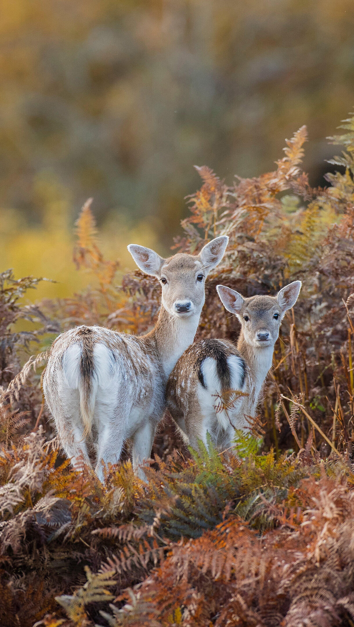 A breathtaking 4K wallpaper reveals a Fallow Deer and its fawn standing attentively amidst the rich autumn ferns of Bradgate Park. Their pale, spotted coats are beautifully illuminated by soft light, creating a striking contrast against the dense, textured tapestry of golden-brown and reddish autumn ferns.