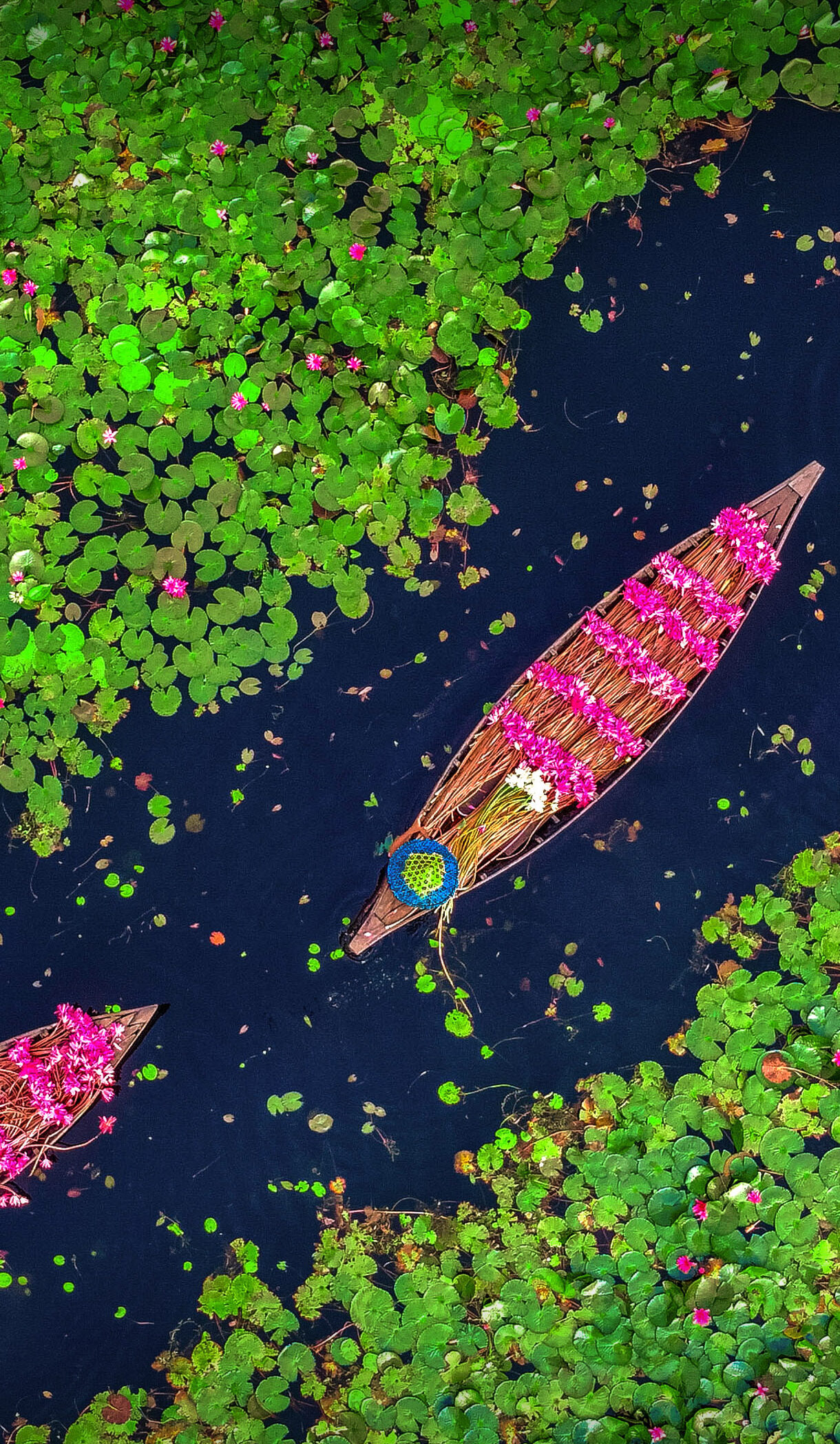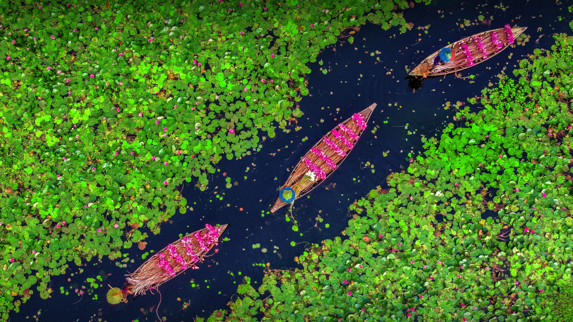 A breathtaking 4K wallpaper capturing farmers collecting pink water lilies in the vast Satla Marshland of Bangladesh. The vibrant pink lilies collected in long wooden boats create a striking contrast against the dark water and dense green lily pads, evoking a sense of peaceful industry.
